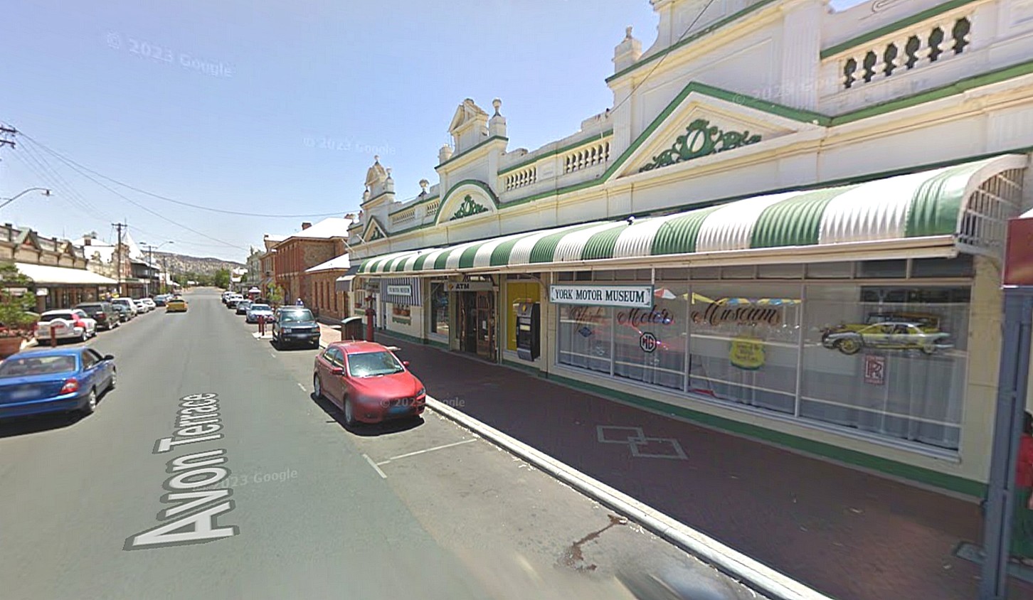 A cold night, and I found it hard to wake up. It was a clear blue sky and soon warmed up and we left about 9.15. We'd been listening to the radio this morning and wondered why it kept going blank and we realised after a while that it actually went dead every time the adverts came on and it wasn't us turning it down. This went on and it was still going at 9.20 and we'd had the radio on since 8 o'clock [no it doesn’t say why and I can’t remember!]. We were passing lots of salmon coloured gums here, reminiscent of the ones near the place called Salmon Gums which isn't a million miles away from here and we're in the right direction for them and they were very attractive against the blue sky with the green foliage. We were soon in York where we walked up and down the main street of this historic town, which we had to admit had some quite nice buildings in it. We find it hard to get enthused about the so called history in Australia. We returned to the van and I’d just nipped into the loo and a lady [Margot] came up and called out hallo and she was parked up the road in a small motorhome which we had seen and she was a lady travelling on her own with a little dog called Benny and we had quite a chat to her. We then had our coffee and a cake sitting on a broken seat by an empty stream and we then went to visit the York Motor Museum just along the road which had 110 vintage and veteran and racing cars, interestingly put together with lots of memorabilia around too.