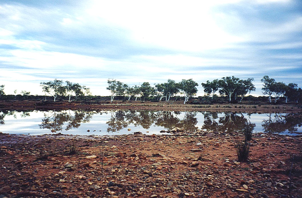 We left and went back to the 'main' road and stopped for lunch in a pleasant little place. These Australian unmade roads don't really have anywhere where you can stop, but we found a track going off and parked on it and walked down to a little river with water and fish in it. We threw crumbs of bread in which they went for and it was very pleasant, quite hot and humid. After leaving this spot, we had to go through a little water splash along the road, which was the river we had been sitting by. We had to make two more river crossings after that. The road deteriorated to become extremely bad as most vehicles would have come from the Great Northern Highway, the opposite direction from Derby, and then gone back again, so twice the traffic. We eventually got ourselves out onto the road to Fitzroy Crossing at 3.15. We'd only been on the road 15 minutes when we came across roadworks for the next 15 kilometres. At least the road wasn't as bad as those we'd just been on! We soon came to Fitzroy Crossing, there wasn't a great deal to see in the town, a bit like Derby and there was a caravan site in the town but it was very unexciting. We continued on to a part of the town to go back to a campsite on the river and in doing so we passed an area with lots of Aboriginal people standing around. It was a place where obviously they went drinking and there were hundreds and hundreds of beer cans in various states of being squashed and lying around in the road. When we got to the place Fitzroy River Lodge camping site, a lot of it, around the actual hotel site,,was burnt . We found ourselves a pitch down on the camping bit, we don't think this place has a lot to offer and expensive at $16 for an unpowered site. I made the most of it by using the swimming pool which was actually was a long way back, right in the hotel complex and took me a long time to locate. The water was refreshingly cool but I felt better for a swim and it seemed to do my burn or whatever under my arm good, because it felt better afterwards. We then had showers. Adrian had been trying to clean some of the red dust out of the van, everything was just thick with it. We then decided to do the washing even though it cost $3 here, but even our pillowcases were thick with red dust. We then hung it on the line in the dark, so hoped it would be dry in the morning. Adrian proceeded to cook lamb chops outside and it was very warm. About 9 o'clock we went over and phoned Emma to say 'happy birthday' a bit early, but got the answerphone. We bought all the washing in as it was already dry. We were glad about that because in the night it was windy initially, and then there were quite a few spots of rain. In the morning we heard that in the West Kimberley's it had rained much more than we'd had - it was not supposed to rain at this time of the year.