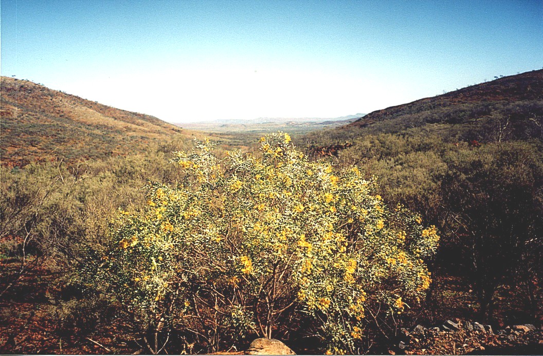 We stopped again beside the road and saw several different wildflowers, so I've been knocking up the old pictures today. We drove into the Karijini National Park itself and headed for the campsite area at Dales. We stopped first at the Visitor Centre in a large tent, with two Aboriginal people working in there who seemed very clueless about everything that was asked. We then made our way to the camping area down a very very bumpy unmade up road for several kilometres. We thought we'd go and have a look at one of the sites near here, the Fortescue Falls, but found it was a long walk. It was now 4.30, so we made our way to the camping area and found a pitch. The sun was too low for us to enjoy it and it was just going down behind the hills. We had a walk out amongst the spinifex and saw the glorious colours as the sky turned pink, a mixture of pastel pink and blue, with a bit of sun shining low onto the mountains in the distance. We came back for Adrian to change the battery. This done we found the pump seemed to be a bit problematic but he sorted that too. We had some more of the roast chicken, cold for supper. At bedtime we went out to see the absolutely star filled sky in the absolute silence.