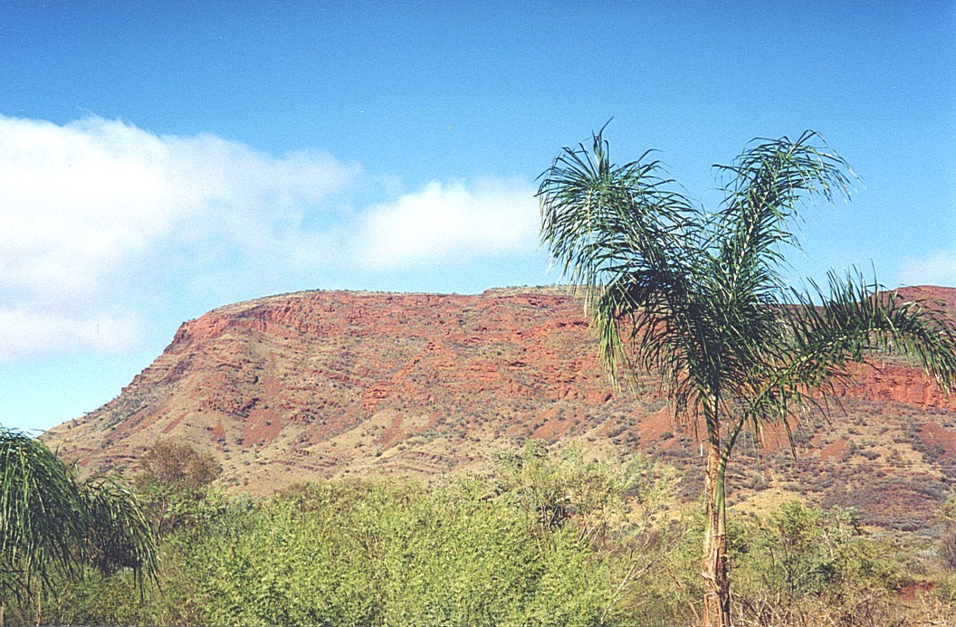 We pulled off for coffee and it was surprisingly windy, but we sat in the shade behind the van and looked out over this yellowy grass, green trees, the hills in the distance, blue sky and apart from a few flies, it was pleasant. We stopped for lunch a few miles before Turkey Creek. We had hoped to pull off somewhere and spend a couple of hours as we have to stay at Turkey Creek tonight in order to go on our 5.30 am trip to the Bungle Bungles tomorrow, and knowing that Turkey Creek didn't seem to be a very exciting place. But, contrary to what one might think, in Australia, it's very difficult to stop along these roads although there's nothing there. The parking bays are usually very uninspired and the couple of rest areas we passed also weren't anything to write home about and not anywhere we would have liked to spend a couple of hours. So where we pulled off was just a hot but windy layby, with pleasant hills around and blue sky, but it wasn't a pleasant lunch, stop. We sat outside but we were just bombarded by flies that made life intolerable. So we reluctantly, left at about 1.30 and arrived at the roadhouse where the campsite was at Turkey Creek, soon afterwards. We gave it a quick look over but we seemed to be lucky to get what appeared to have been the last powered site. We thought we needed electricity to have some air conditioning as it was very hot - we found the temperature was 90°F. When we went round to locate our position it was actually being watered, so it was rather wet, but not unpleasant and what was a pleasant surprise was to find that there was a minuscule swimming pool almost adjacent to our little spot. So we got ourselves settled and ready to go into it. We did go and inquire about the helicopter flights, so that's a possible for Monday. We soon made our way to the swimming pool and had a pleasant swim. It was a small pool and obviously hadn't been there very long, but it was lovely. We sat around for a bit and came back and got a bit settled in and had a cup of tea. We had just sat down with that outside when a person came up called Lorina who was a representative for the trip tomorrow, when we have to be ready by 5.15 in the morning. She was a very chatty person. We got ourselves organised for that, read a bit, then went and had a shower and hairwash by which time it was four o'clock - maybe, as I found my watch had stopped. We cooked fish in the microwave and ate outside, it was very warm, and then about 8 o'clock we were thinking of going to bed because of the very early start in the morning, when Lorina came and said the trip was off tomorrow. They had got a problem with the tyres on the vehicle on which Tony had only just come back. So the possibility is that we go the following day and they would pay the site fees for that night, so we had to wait and see what happened. We stayed out until, 9.45, it was a really warm evening, there was a very pleasant atmosphere.