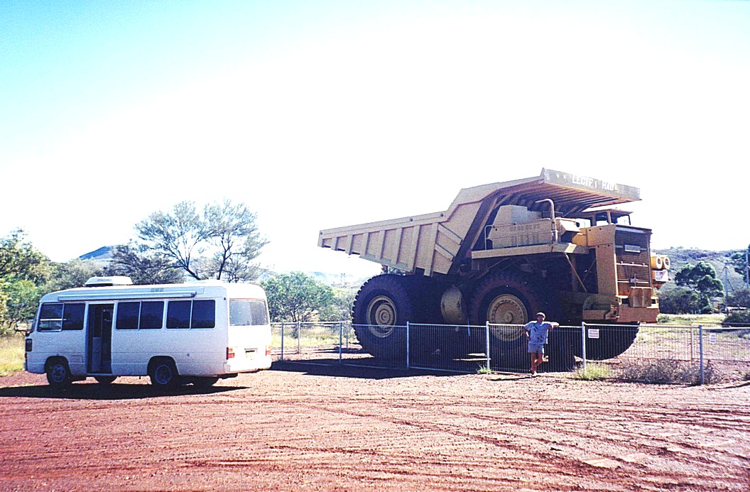 A difficult morning followed. We went next to WesTrac where we were hoping to get a battery, but things didn't go smoothly. After a long time it turned out that we had to have an invoice to show where John had bought it. This was difficult with lots of phone calls and virtually the rest of the morning was spent trying to sort out this problem. We went back via the town and had the battery tested which was flat. Adrian made lots of phone calls and in the end tried to ring John but all we got was the answerphone. We wanted to speak to him because it turned out we're going to have to buy a new battery at £70, not just going to exchange it as we had hoped as we can't get hold of the invoice. We could have got a cheaper one - £50. We deliberated on what to do, we were a bit despondent about it all and having to fork out our own money again, which we hope John will pay up at the end. I had made coffee during the time in the car park in Tom Price. We went shopping in Coles, thinking 'oh that's good, we'll stock up on some food as we're going out of habitation areas’, but Coles was being moved about and redone so it was difficult to find anything, it wasn't a particularly good one anyway- no cheap wine in the bottle shop. We'd been into the tourist information and found that at least the road into the park was open, even it did seem the road we had come on yesterday was now closed. It was now lunchtime, so we drove around to a site where there was a big truck that they had used in the iron ore mine. It was 11 metres long, by seven metres by six metres. The wheels were three metres diameter and the engine was twice as big as a grand prix engine. Our Coaster beside it was dwarfed.