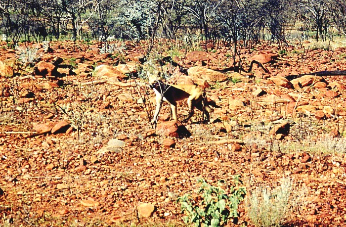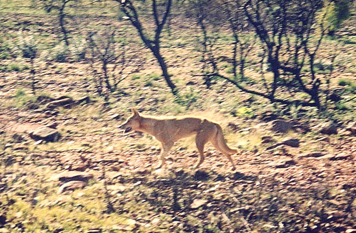 It was clear blue sky and hot now with a just a breeze and beautiful with these stark mountains around, the red soil and the green vegetation, I like this area very much. So we sat there and had lunch of a hot chicken we had bought in Coles, sitting outside at a table and then went off to get the battery. Loaded with a new battery, we left Tom Price at 2.10. We took the road into the Karijini National Park and I was revelling in the beautiful scenery which to me is very Scottish but with beautiful blue sky and very warm. We first saw what we thought was a dingo, we took a couple of photos.