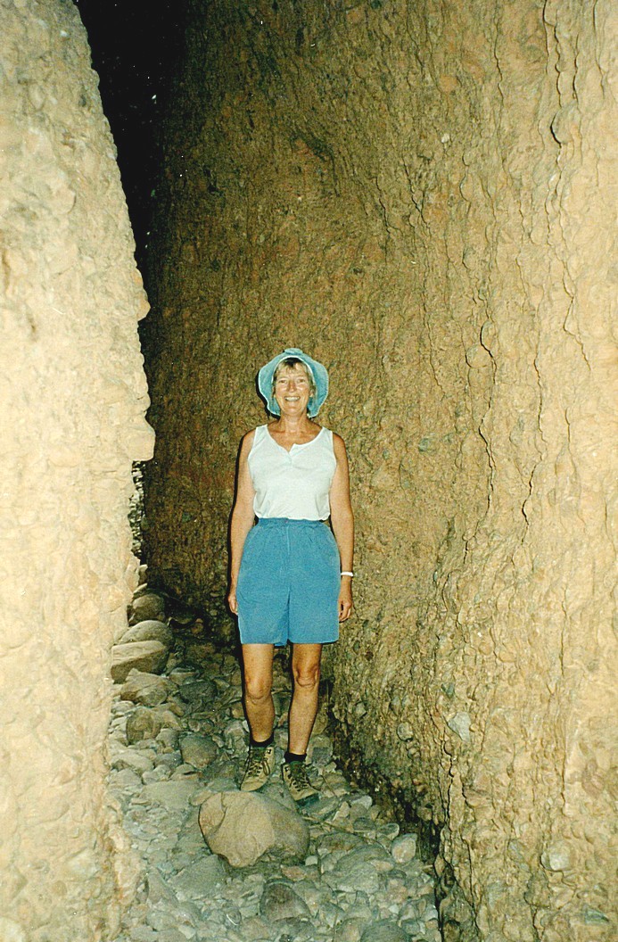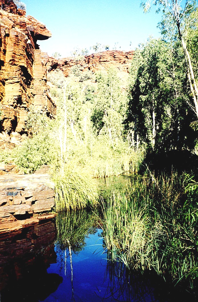 Friday 19th June 52 km We awoke at 7.00 am to see the sun just rise. A clear blue sky, it seemed quite chilly inside but we had breakfast sitting outside in the sun. Unfortunately a bit of my tooth broke off. Just after that a ranger came along and spoke to us. We left at about 9.00 o'clock and drove down to the carpark for Circular Pool. Here after sorting out the situation, we climbed down a steep gorge. I was very proud of myself for doing this because as far I was concerned it wasn't at all easy and it was a very long way. At the foot of the gorge, we then had a beautiful walk along it. We'd seen a group of young people who were out on an 'Explore type' trip, they were just ahead of us. We followed along this gorge which had a little river running through it. The cliffs were a brilliant red, the sky was pure blue, with green vegetation and white bark on some of the trees.