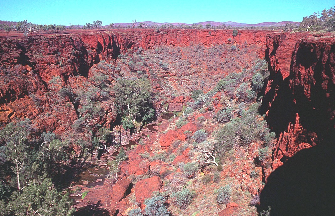 A clear blue sky when we awoke, we had our cup of tea and decided to get off early to view some of these gorges which were supposed to look good in the early morning light. Hence, we drove to the Knox Lookout first. We weren't sure about this thing about the early morning light because they were so dark. The contrast between the sky and gorges made it very difficult to see and certainly made taking photos difficult. We drove back to the Joffre Falls, the roads were very variable and some of the time pretty good, but then we went through some bad areas as a result of the heavy rain a few days ago. At the Joffre Falls, again a very deep gorge, we saw the three people who'd been camping near us climbing down into it, they seemed to have got down there very quickly. I wouldn't have liked it, it was so much scrambling down into the gorge which was enormously high.