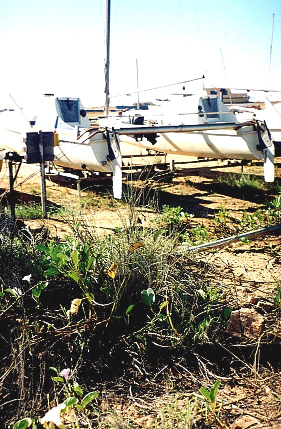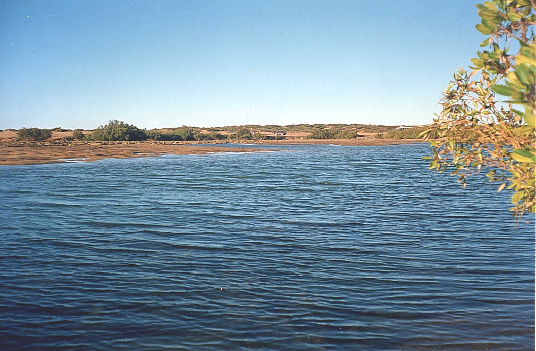 We neared Port Headland, it was now very flat and very boring looking. The phone was now working and we got a message from Tom to say that he was home from university and at Elm Gable. We stopped by a so called lookout by a large salt mountain, this area is a huge exporter of both salt and iron ore and we then proceeded to a campsite. The campsite was full, so we drove back into Port Headland finding very little to see, a very bleak place, it reminded us of Whyalla on the Eyre Peninsula. We found a tiny little park beside the sea where we had our lunch, it was very hot, but not a swimming beach, quite rocky where we were and very shallow. We then drove on further into Port Headland, located the tourist information and asked the lady in there how we could get in touch with Nicky‘s uncle, which was one of the reasons for coming here. We had seen the yacht club but didn't think he could be there but in the tourist information she said yes, that he could be at the Yacht Club. So we made our way back there, there was nobody around, although we did locate his catamaran called 'Sea Wind'- we knew the name of it. Adrian tried phoning several times but we couldn't get hold of him. We were just on the point of leaving when a family in a car arrived back and Adrian found out that he lived in a house, in fact back near where the caravan park was, so we set off in that direction, stopping off at a little park to empty the loo. We located Gordon's house and Adrian left a message to ring us if he came back. An ice cream van had just gone by and a chap came out from a neighbouring house and tried to buy an ice cream from us - we didn't have any to sell him, and we weren't playing Annie Laurie! We made our way down to Pretty Pool and it was a pretty little bit where the river came out to the sea. We had a little walk, it was a bit blowy, but then we put the seats out in front of the van overlooking this little river and spent a lovely hour or two.