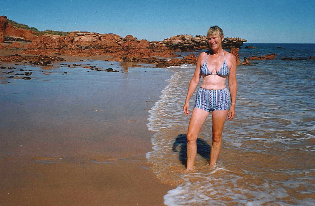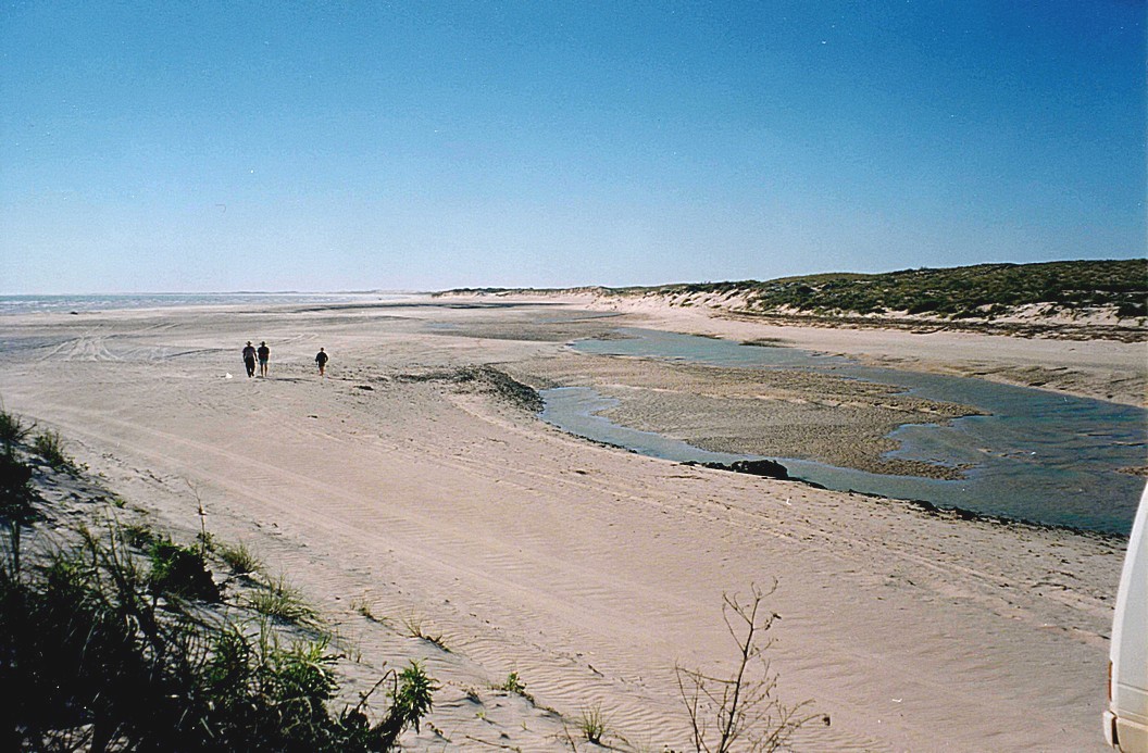 Tuesday 23rd June 0 km We thought we'd stay there two days as it was such a lovely location, but as luck would have it, it was very windy in the night and in the morning very gusty. We'd heard of a minor earthquake at 6 o'clock last night, at Marble Bar, not that far from here. We certainly heard a strange noise last night but at that time we were out on the beach and didn't know if it was connected or not. So we enjoyed looking out from the van, it looked like desert behind us or it did until the tide came in and the river filled up behind us and the tide came in quite closely, not far from where we were. Everybody except us, was out there fishing. We had breakfast inside because of the strong wind. We hoped that it would die down, from the forecast that we heard it seems that it might well do. We had our elevenses sitting outside and then decided to go for a walk northwards, it was a long way along the beach, we had to cross the river which had come in at that point because it was high tide. The wind was quite strong but it was a pleasant walk and after we had walked for quite a long way, about half an hour, I had a quick swim in the sea. It was coolish, and afterwards we lazed around a bit and then walked back chatting to somebody else in a 'coaster' on the way. When we got back I cooked lunch using the new brown rice, which you cook in the fridge - no that wasn't a mistake. You put it in the fridge with water and then it's ready. I did fry it lightly afterwards in a pork stir fry. We sat outside to eat this, but the gusts of wind did mean that sometimes you got sand with your food. We both washed our hair. I put on my new little two piece costume and we sat outside. I finished reading my ‘travel stories’ book and Adrian was writing an epistle about Gordon. We had a cup of tea and the last piece of fruitcake which has done us very well and we then went for a walk along in the other direction, quite a long way along the beach and came across quite a lot of other caravans, tents and motorhomes and then cut across and walked back across an inland bit, where we saw lots of kangaroos. When we got back, we stopped to talk to two couples who are both in 'coasters' almost next to us. One of the women is in a wheelchair and had been paralysed for the last nine months and her husband had adapted the van to fit in with her. While we were talking to them I was aware of the sun, which was fading fast and was actually going down, so I went back to get my camera and walked out to the edge of water but unfortunately too late to take a picture of the sunset, which I'd wanted to do last night. We got a drink and went to sit outside but it was already chilly once the sun had gone down. After it got dark, the stars came out quite magnificently. We sat looking at one collection of stars which looked slightly familiar and we realised that it was the plough upside down. Later in the evening, we saw a shooting star going across the plough. Then I saw another shooting star and also we saw what Adrian said must have been a satellite that went right across the sky at speed. It wasn't a shooting star but too fast as he said for an aeroplane and then it disappeared. Also while I was sitting out there a huge moth, which Adrian had thought was a bat, came and landed on my hand and then around my face, fluttering and fluttering like anything. It looked a bit like a tortoiseshell butterfly but it was a moth and much bigger, so a nice little bit of wildlife. We then came in as we were surprised at how chilly it was.