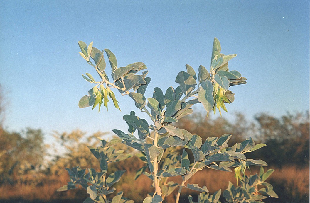 As we were leaving, we stopped to see the husband of the two couples and this person's wife who was in the wheelchair. We asked him and he said she had multiple sclerosis so we gave him the tape of Cari Loder that Val had given me. We then stopped by the Rangers hut and paid him for our visit. The route back to the main road, as we knew, was very flat and unexciting and low vegetation, there had been a lot of burning in the past. We pulled in for coffee just past the turn off to 80 Mile Beach, it was a clear blue sky as before but the wind just as strong which made being outside unpleasant and with the door open large numbers of flies came in. We had been amused at coming to a sign saying it was the Shire of Broome, which was 430 kilometres, 260 miles until Broome - quite a bit of a Shire. Our next stop was the Sandfire Roadhouse for fuel, as this is the only one for the next 300 kilometres. This certainly was a bit of an oasis in the desert with a lot of trees and plants and a little park and some water lilies in a little pond. I had a free cup of coffee for the driver, a bit of a cheat because I'm not the driver [ it was called 'Driver Reviver' - an attempt at reducing drivers falling asleep on these long distances]. There were purple and red bougainvilleas. We looked closely at these for the first time and noticed that there is a tiny white flower protruding and the so called flowers are presumably coloured black. After this, the scenery was absolutely nothing but flat grass. We pulled in for lunch at a large picnic area, lots of different wattles around but also flies and very windy. We had a visit from a nice little honey eater. We carried on about another 80km kilometres or so. We were going to turn down to Port Smith, but this was 23 kilometres on a bad unsurfaced road. We started down there and decided that we weren't going to make it, so managed to turn round. We passed one or two rest areas that would have been more suitable than the one we finally pulled off into, another 80 Km or so on, about 50 Km south of Broome. We arrived at it about 4.15 and there wasn't a great deal of space but we located a little place on our own and then with Adrian's clever manoeuvring and bits of wood under the wheels, we made ourselves level. It was very warm. We enjoyed sitting outside with a beer and watching the many birds and the trees. There was a plant just by us, like a pea plant, it had long green flowers on it.