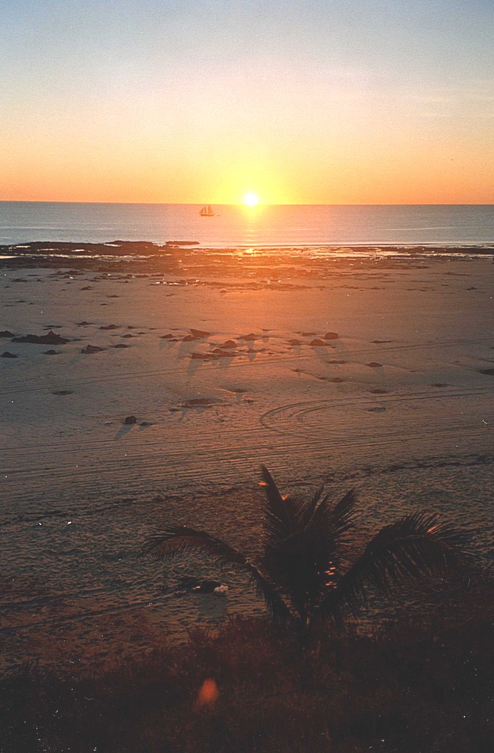 All told we really enjoyed the spot. Just as we were making to leave one or two other cars arrived so we knew it was definitely time for us to go, now being just about 2.30 We drove back into Broome looking for a Toyota place and not finding it at first. I went to the tourist information and enquired about a couple of roads that we need to travel on after Broome as to whether they were currently goable or not. We located the Toyota place and found that their price for the piece needed for the air conditioner was $1000 or so, very expensive. So we headed for Chinatown shopping centre, went to collect my photos and found we hadn't got enough money, as Adrian had paid the chap at the garage in cash, and we had forgotten it was 2 films, so we had to speedily go across to the bank and get some money, coming back get the photos, which seemed to be good on a quick look through. We then had a long shop in Coles including the bottle shop afterwards, where we got a couple of bottles of wine. It seemed to be all Chardonnay in there and as we were not really drinking Chardonnay that wasn't very helpful. We actually bought, a weekly telegraph as well and put all this into the van, as I'd remembered seeing a nice ice cream shop where we hastily made our way. It was now about 4.50 and pretty close to 5.00 - everything seems to be shutting up at that time. We bought an ice cream, I had a baby sized honeycomb flavour and Adrian had a rocky road, but it was certainly a nice home-made ice cream. We then realised that the sun was going down fast and we'd like to see it set so we hastened towards Cable Beach. There was not really anywhere to get down to the beach except the Cable Beach entrances and got there just as the sun was setting, a little bit of cloud had come up which hid it from view - crowds and crowds of people there. It did seem to be the thing to do to come and watch sunset at Cable Beach with your picnic or champagne or whatever. Coach parties there but quite a nice atmosphere and lots of people with cameras on tripods, so we joined in this pleasant atmosphere and walked down to the beach and across to the rocks and back again. We drove round to the campsite and began packing away the shopping and Adrian phoned up Broome Camel Safaris and booked us in for a camel ride tomorrow morning at 10.30. It was a pleasant evening, warmer than the night before and we sat outside, cooked pork steaks and enjoyed the night sky again. We then came in to look at the new photos, the newspaper and Adrian to his computer magazine.