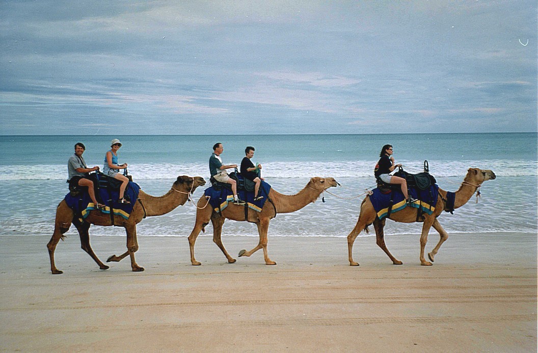 When we woke up it was cloudy, or some clouds in the sky, and a sporadic rainbow. It felt rather humid, it had felt quite damp last night. There was still lots of birds song, we saw a beautiful green and red parrot. We had showers and we sat outside to have breakfast. A lady from another Coaster came and spoke to us, they were hoping to go on the Gibb River Road, and about 9.30 we left for Cable Beach. We arrived at Cable Beach in plenty of time to suss out where the camel rides left from. We collected the video camera and then we had a very enjoyable half hour ride along the beach and back again. There were three camels and one person leading and we were on 'Banjo' at the rear, it was nice being up high and it was pleasantly warm, but unfortunately cloudy for the photographs. A person called Alison, who was running it, took photographs of us and video and all in all great fun.