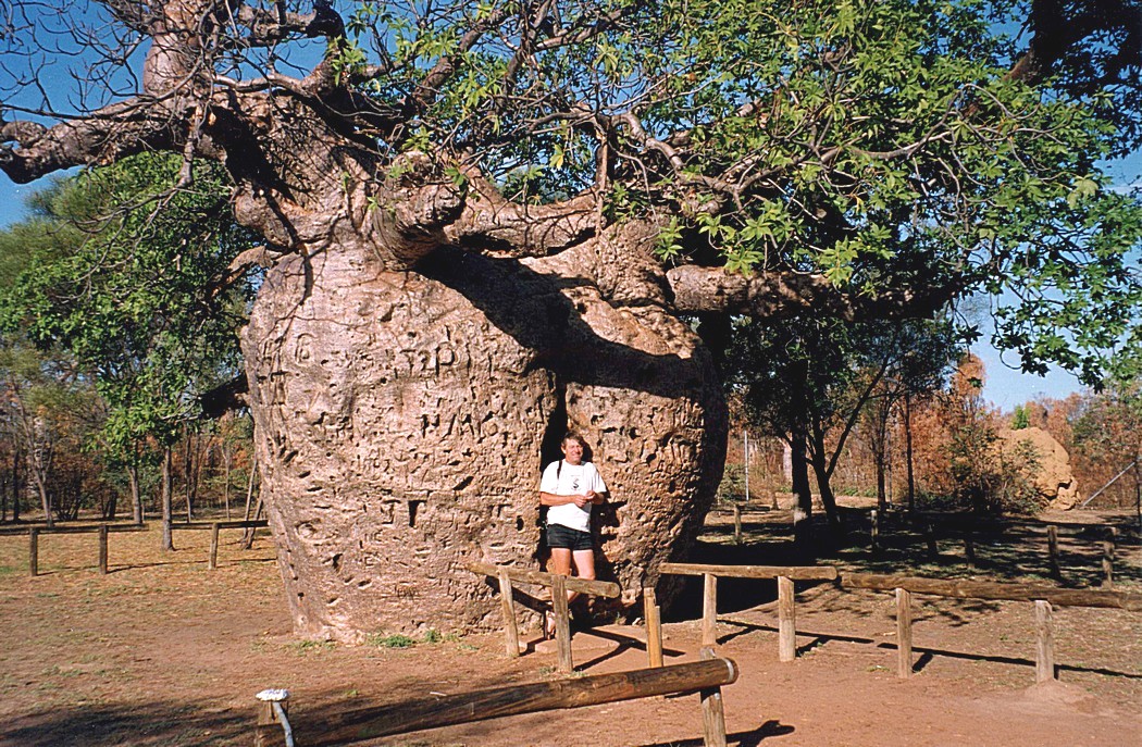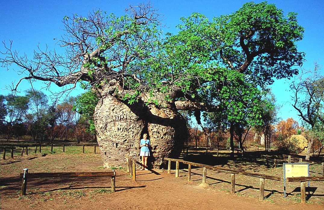 It was blue sky, slightly windy with lovely birdsong as we woke. We had showers, they were rather inadequate as this campsite. We came back and had breakfast outside and put the phone on and had a message from Simon to tell us that Jim O'Gorman had died [Our neighbour in Hermitage], which made us both feel very very sad. We were ready to leave at 9.15. We left Broome and drove east a few kilometres and then turned off north on the road towards Willie Creek having travelled towards Derby for a short distance. The first bit of it was tarmacked, and then the road that went off to Willie Creek wasn't and the road on north wasn't either after a few miles anyway. We went some distance along there, but it was badly corrugated and didn't look too good. [we had intended to go up northwards here originally, but were glad we didn’t, as we met Geoff and Brigitte in Darwin later, and they did, and got stuck up there for 3 days as it rained heavily and the road was undriveable to come back]. We returned to the main road and stopped there for coffee, where we spoke to a couple, possibly German, who were thinking of cycling up to Willie Creek. We left just before 11.30 on the Great Northern Highway, on a road that was flat and rather monotonous, fringed with the young trees, often yellow flowering wattle. We stopped for lunch in a rest area after about 50 miles or so from the turn off of the Great Northern Highway going south. It was very hot, we sat in the shade behind the van. We saw an increasing number of Boab trees as we got nearer to Derby and we stopped off to view the prison Boab tree, a large Boab tree, where they used to keep Aboriginal prisoners on their way into the town.