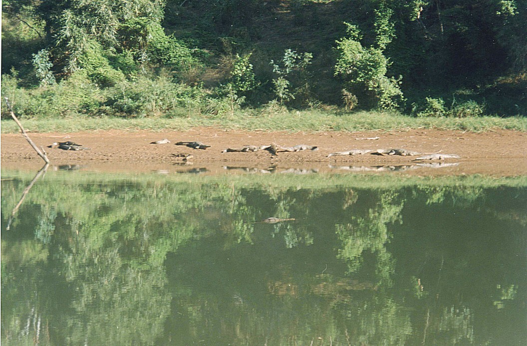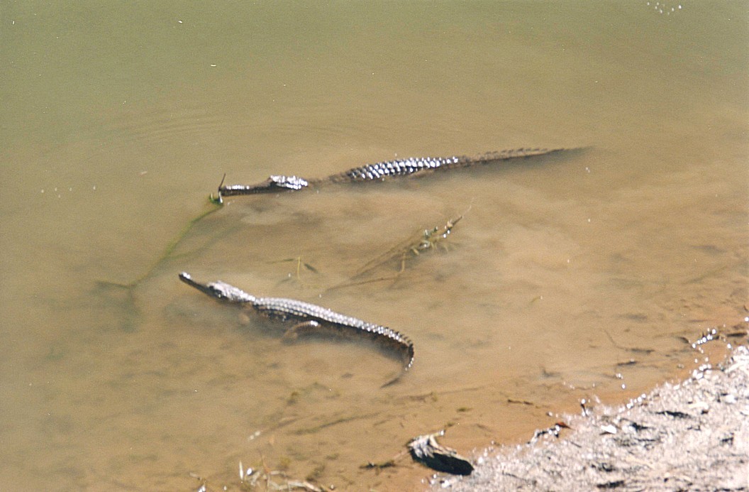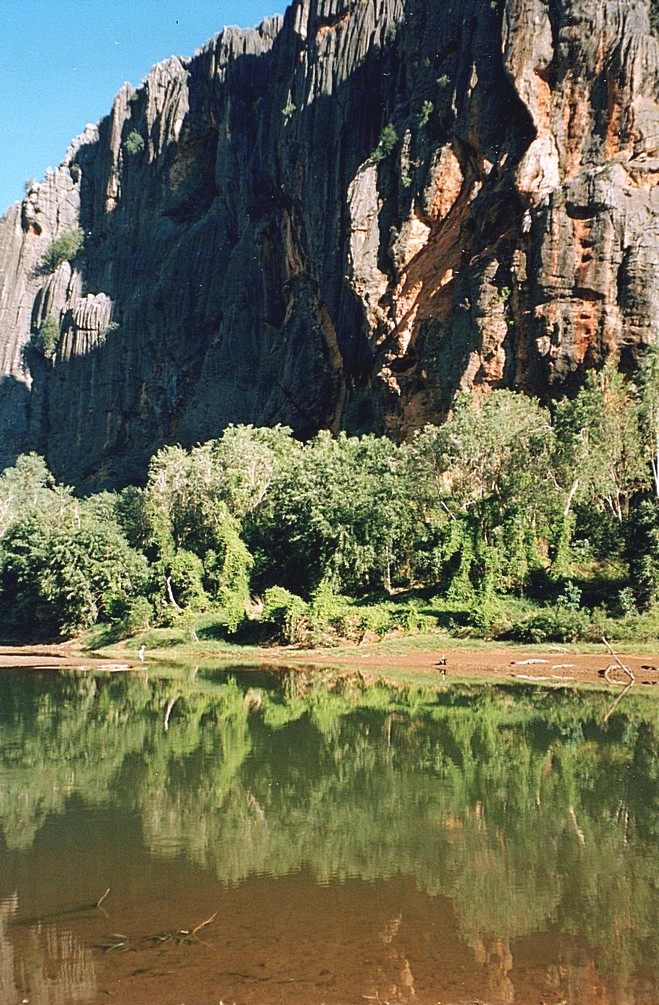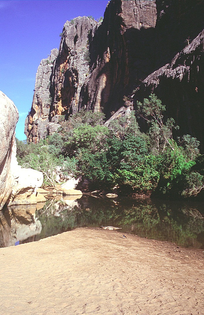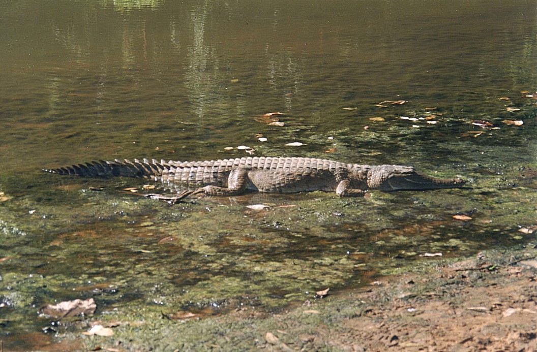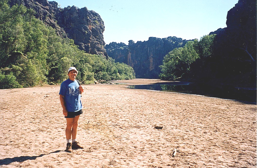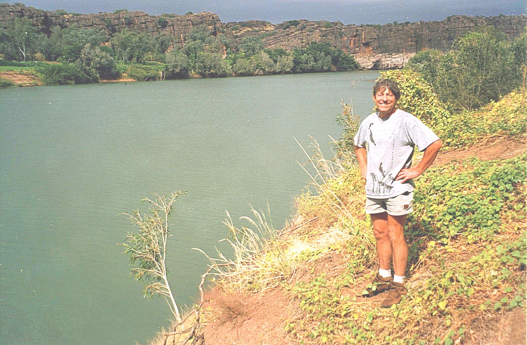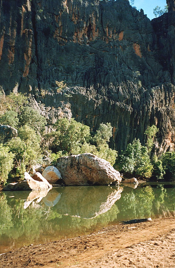 Wednesday 1st July 148 km We were woken by the alarm bird, a bird that goes beep,beep,beep like an alarm going off, and also by a lot of activity, people were up and about by 7 o'clock. In fact, the German group of 8 people camping in little tents, left just after that. We sat outside with our cup of tea, the gas had just run out It was a beautiful morning and magnificent looking across to this high ridge, cliff face really, in the morning light. We then decided to go for a walk back to the gorge across through the savanna grass, and we took all the cameras and also did some videoing and we saw just dozens of crocodiles. One was on the ground just in front of us, by the water and just lots and lots, lots on the other side and lots in the water.