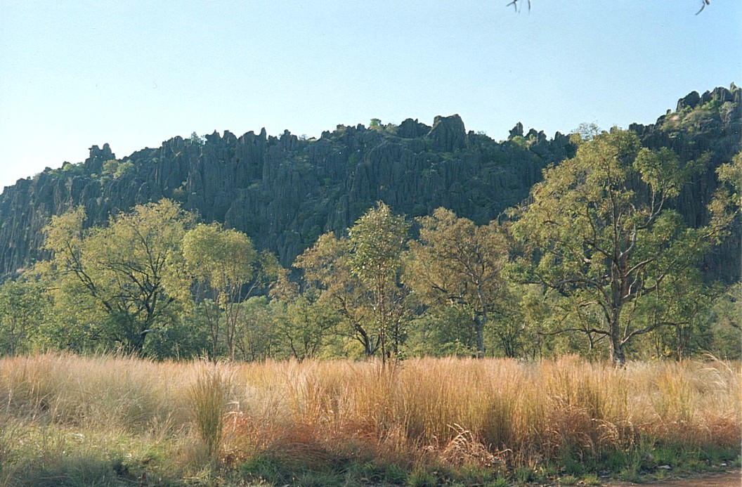 We'd expected the bad weather to have gone, but awoke to a cloudy morning and a little flurry of rain and still very overcast. On the radio, we heard of the surprise of people of this unusually bad weather for this time of year, when it's not supposed to rain, but to be just blue skies. We also heard of a tragedy of a family in the Pilbara who got stuck in their vehicle and had gone for help. A baby had died and others injured. A man had walked 80 km to get help and it brought home to us the remoteness of this area. Adrian had had a go at sealing up some of the cupboards to try to stop this red dust getting in and we then went for a little walk further round to this viewpoint over the countryside and found other suitable spots where one could have camped. In fact, I would have said this was quite a good place to stay, although it doesn't feature in our free camping book. We left just after 9.30 and continued to Mary River where there was a rest area and this was where we stopped for coffee. The way there was quite interesting, not absolutely flat and with quite a lot of flowers and flowering plants often yellow flowers as I have mentioned before and pink Mulla Mulla and some bushes that look rather like a deep lavender. Perhaps the way was made easier because we were listening to side 2 of tape 9 which was of Gladstone Beach, and Coral Bay and Exmouth and so had lots of interesting things to listen to, so we relived all those experiences as we were driving along. The Mary River Rest Area was interesting in that you first had to cross the river, there were some pools of water in the wide river, but not much water in it – in fact there was more water on the roadsides round about after the rain. And this was a place which had set itself up as a free camping area. There were perhaps about 20 caravans etc. using this area, and while we had tea and coffee and a very nice Chelsea bun bought in Fitzroy Crossing supermarket yesterday, about the only bun looking thing, but so large that it did the two of us quite adequately. A chap came over and spoke to us, Adrian thought he was Dutch and I thought German, he was wearing clogs and had a very broken English accent, but in fact he was Danish but had lived over here over 20 years. They lived in Cairns and they were travelling around the opposite way to us but 18 years ago they had travelled around the way we're going, taking two years to do it. We stopped for lunch just before Halls Creek in another little pull off just before Rockhole Creek, which wasn't actually a parking space. We sat inside, the weather was variable, mostly sunny by now. There had been some very strange clouds across the sky, rather like corrugated folded rolls of cotton wool. We stopped in Halls Creek and got diesel and went to tourist information and booked a trip for the Bungles Bungles for Sunday. We went to the post office and had a long wait, but managed to get some money out after she told us that we couldn't on our card and got some more stamps, posted some cards I'd written last night and then we tried to phone Emma to wish her happy birthday and got the answerphone. We had bought a phone card at the tourist information and so we phoned Tom as well and left a message too. We now set off on the track towards old Halls Creek, there was whole host of galahs by the side of the road . This road only had a surface for a short distance and the first thing we turned off to on the unsurfaced road was the so called China Wall, 16 kilometres of a natural wall, which certainly looked man made, it was quartz sticking out from the hillside, white against the colour of the hills.