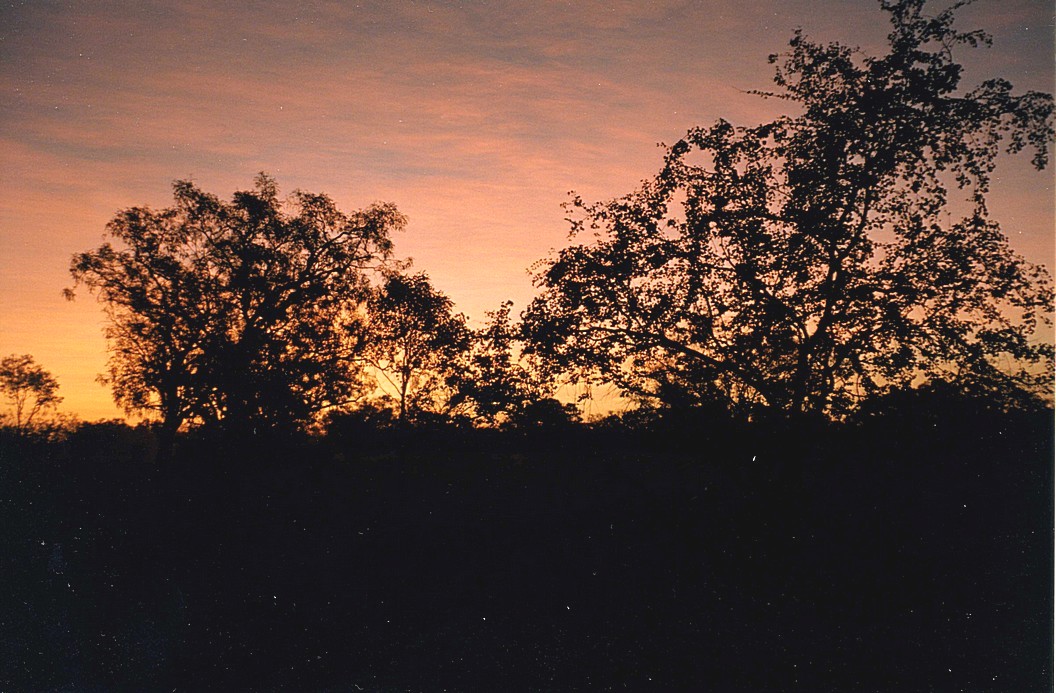 There were also little red dragonflies and very noisy white parrots , a heron and sometimes birds of prey overhead, so all in all a very pleasant walk. Sometimes we were walking along what was like the river bed, gravelly. There was a family with four children walking along too, I just thought of times gone past. We returned to the van about 4 o'clock and then made our way to the little caravan site which was there, very low key but an absolute delight to find that there were cold showers, even if the water wasn't that cold, but after a long dusty walk it was very very welcome. The sore under my arm was a bit better, I'd taken an ibuprofen tablet. We think it was some sort of burn, how on earth I could have got it there I don't know, acid burn or bleach or something like that. I had found the best way before we went on the walk was take an ice pack from the freezer and wrap it in a tea towel and place it under my arm [we never did find out what it was, but surmised that the person who cleaned the showers in Derby had used bleach and had not washed off the area where one put the soap and so Rosie wiped it on herself via the soap]. A delightful evening followed. Pleasantly warm, though it did cool off a lot during the evening. We both put on some new anti mozzie stuff, tropical strength and certainly I didn't get bitten. There was a lovely sky as the sun went down. I walked out a little way amongst savanna grass and took a photograph, and we sat out really enjoying this atmosphere.