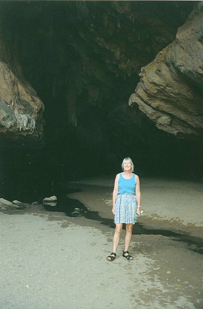 All around it was just dry Savannah long grass but rather like English wheatfields, very picturesque. Just after this, we noticed something had got caught on the roo guard on the front and we thought it was a cicada, but then I said it looked like a locust, at which point we were bombarded by hundreds and hundreds of what obviously were locusts. Luckily we seemed to soon get out of them, but everywhere does look heavy and dusty and we were wondering whether it was clouds of locusts. We stopped at Tunnel Creek and now 11.15 we thought we'd have coffee. We walked across to the actual Tunnel Creek and we proceeded to attempt to go through the creek not knowing how I would cope with this. But in fact, despite all the odds, we did make it. It was a very long rocky tunnel through this escarpment of rock and went for about 750m. Very, very uneven surface and we knew that we had to wade through water. So we wore our sandals and hoped they didn't mind it too much and we had to hope we didn't bash our toes. My sore arm survived it, my fear of claustrophobia and darkness also survived it. We had to watch our heads and in places it was very dark and we often had to wade not just once or twice, but lots of times through pools of water of various depths with the deepest up to the top of our legs. We had to be careful that we didn't go even deeper than that. We knew there were crocodiles in there, we did see one, but all told it was a good experience to have done - there were great stalactites and other people coming against you in the darkness shining a light. It had quite a magical feeling about it and I felt very pleased to have accomplished this. There were 4 kids together from different families, who obviously enjoyed it.