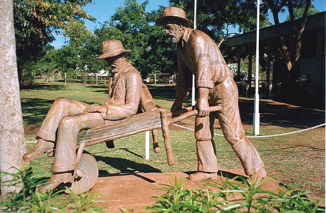 Saturday, 4th July 167 Km We awoke to a blue sky, to hear Louis Armstrong on the radio singing ‘what a wonderful world’. We ate little scotch pancakes for breakfast, inside. We heard an item on the news saying it was the 20 years of the Solomon Islands independence and we also heard more of the people who were lost in the Pilbara, we knew that the baby had died, but the other people seemed to be recovering and the woman who was on her own, in her 60's, seemed to be all right and one of the men seemed to have walked 200 kilometres. So that all seemed quite remarkable that they at least had survived. We set off about 8.30, on the unsurfaced track, back to Halls Creek and it looked beautiful, the scenery was very lovely against the clear blue sky. At Halls Creek we located the statue to Russian Jack, one of the early pioneers, who supposedly pushed a sick friend in a wheelbarrow, 300 kilometres across the bush to get medical help and it was symbolising the pioneering spirit of the early days.