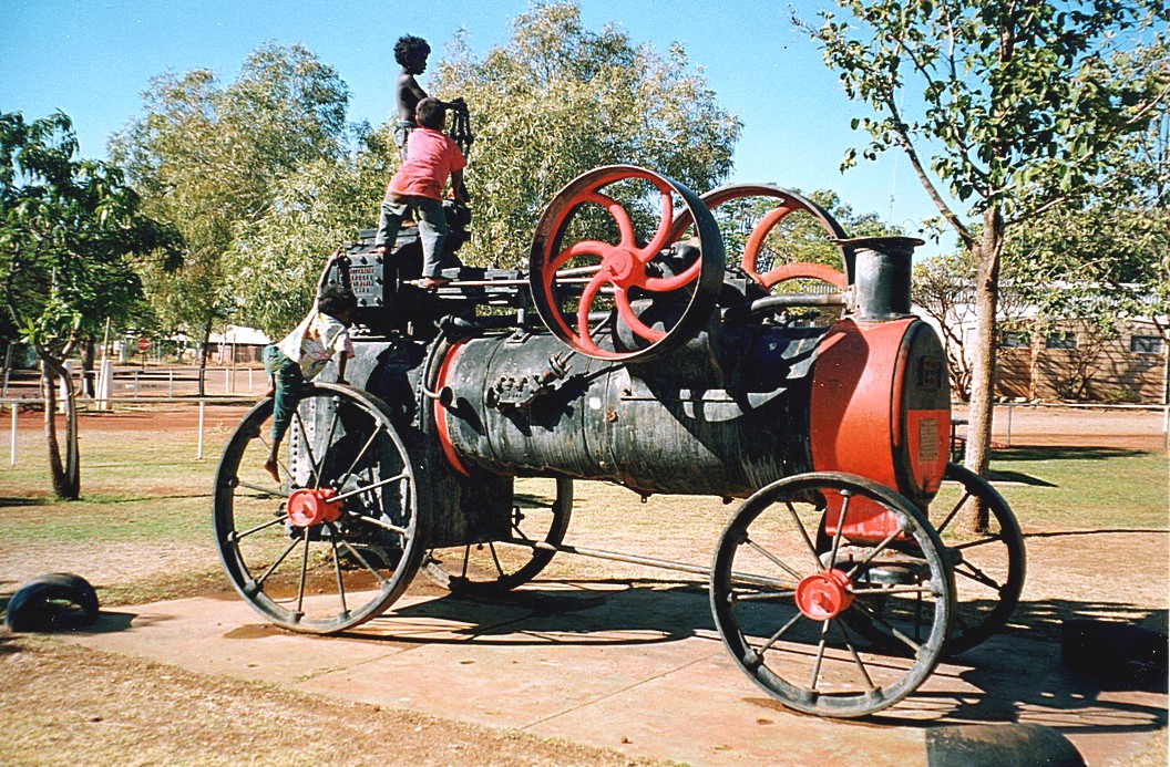 There was very little left in this little town of Halls Creek now, very little of of interest that is or of beauty. We found we were adjacent to the tourist information where we were yesterday and a little park, which had several items in it, one being a 1885 steam engine from England and there were three little Aboriginal urchins playing on a little roundabout. They were dabbing their feet in the rain water around as the ran around barefooted. Then they scrambled onto the steam engine and I took a photograph of that , it seemed to symbolise quite a lot.