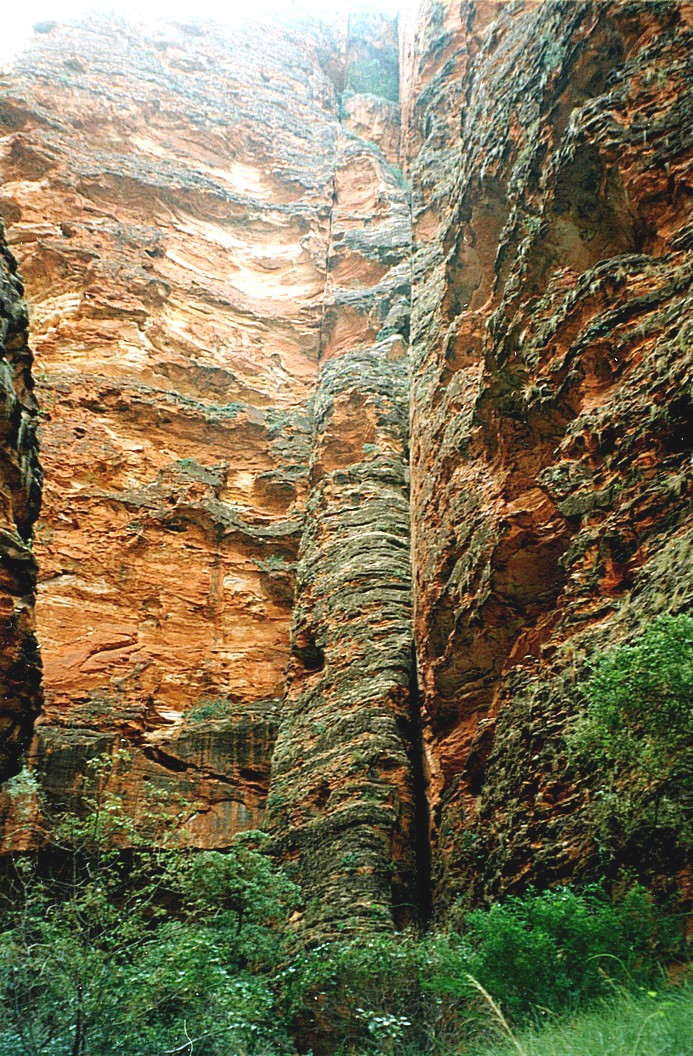 Monday 6th July 0 miles It was a very hot night. We were awake at 4.00 am although the alarm was set for 4.45. We got up soon after, had a cup of tea and cereal and we left at 5.15 am on 4-wheel drive coaster with 14 other people and Lorina as our driver and guide for our day in the Bungle, Bungles. This started with 40 minute down the main road and then went onto a track into the Bungle, Bungles This was the roughest track one could imagine - we'd been warned of this and luckily I had my backfriend and later I needed my to support belt on as well, because we were thrown around like anything. We for the most part were sitting in the backseat which was extra bumpy. At 7.30 am, which seemed halfway through the morning to us, we stopped for tea, coffee and biscuits and then on into the Bungle, Bungles themselves. We stopped to have a walk in Echidna Cavern which we went in. Very, very deeply into this enormous cavern, through a tiny crevice at the bottom of these towering mountains.