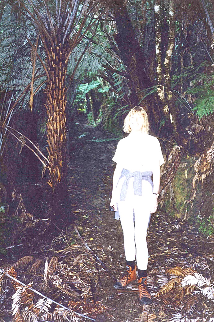 The sun didn't come up behind us as we'd hoped – it was a grey morning and stayed that way all day. I tried telephoning Thomas, forgetting at first to add the 1 to the code, then realising it was the answerphone, put the phone down immediately, but it had already grabbed the $3.30 charge! Adrian attempted to make toast over the gaz ring to go with our spaghetti! Only half successful. Our "New World" brown loaf is keeping well. We had sat in bed writing the last few postcards, so it was 10.30 when we got going. The area around the thermal pools was quiet and empty. An hour later it was packed with cars and we passed lots of cars apparently coming out for the day. We called briefly in at a shop, buying only milk and another phone card, then attempted a Woodland Walk at the far end of Hamner. It was delightfully autumnal – leaves underfoot, trees laden heavily with berries and the more subtle yellows, unlike a brilliant reds and oranges for autumn. The air too felt autumnal.