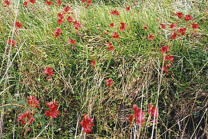 A buzzing of a wasp disturbed me several times in the night and notably at 5.00 am, when we found that it was outside, but trapped in the air vent above our heads. Adrian managed to bash it out. Consequently it was past 8 o'clock when we woke up again. The sun was trying to shine through over the hills. We continued to follow the Buller River through two gorges. At Murchison we had looked for a shop, but the supermarket, like everything else, looked shut up for the weekend. Murchison had been destroyed by an earthquake in 1929. The attractive houses we saw must have been built since then. There were several "pull off" places along the road – one to a waterfall – a very bumpy and unmade up road, with no indication of how long we had to drive. Another was for a swing bridge over the River, but that held no attraction for me. At Lyall there was a signpost to the cemetery – with two graves! We passed bushes laden with berries and also some very attractive flowers beside the road – from a distance looking like poppies, but with flowers nothing like them. I think they might be sparaxis.