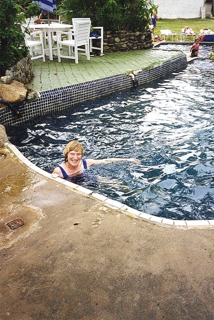 We enquired about the glass bottomed boat, but thought that we would prefer to go snorkelling. We hired (free of charge) masks, snorkels and flippers from the jolly activities lady. Then what a delight! The Coral comes right into the shore, so we spent the next hour or so thrilled by the magic of the Coral Reef. Coral so beautiful – branching coral tinged with blue or purple; brain coral; – all kinds. And the fish – a myriad. Perhaps 20 or 30 different sorts – tiny deep blue ones which lived amongst the Coral – also large starfish of the same rich blue – black and white zebra fish; fish with a pretend eye at the rear; Brown plaice shaped fish which came to say hello; camouflaged "giraffe" skin fish; some of which tried to see you off. Shoals of long skinny see-through fish near the surface. Such magic! We had entered another world – the surface of the sea was the end of it. The great delight was that it was all at standing depth, with sandy bottom to stand in between. As I kept getting water in my mask and tube, it was easy to stop and empty them. Eventually we thought we ought to come in. The next joy was our lovely shower which we stood under until all the salt was washed off our skin and our hair was clean. It was now nearly lunchtime. I did have a quick swim in the pool.