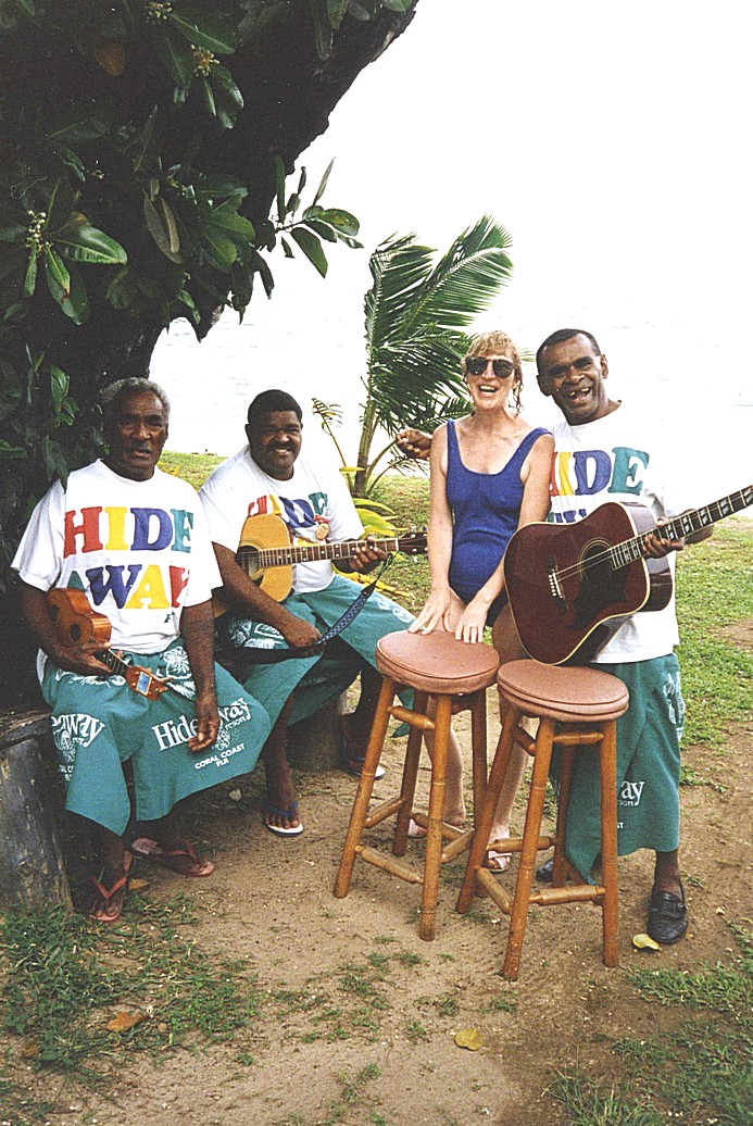 We were so lucky to have this opportunity – apparently it is only the 3rd time they have done it – and it was just the one day we were here. We all trooped back to "Hideaway" – on the way back along the road we met and elderly Fijian gentleman who stopped to speak – again such a genuine man. He explained about the flower garlands and how much it means to give one to someone. He spoke with such love and sincerity – these people really are something special and we in the Western world should learn from them. As a race they are quietly spoken and laid back gentle and loving. And they smile and welcome everyone. By now we had met up with the other English people – a couple Mike and Dawn – late 30s (?) and their 3 children, Nicky (13), Russell (12) and Stephen (8). They have spent 5 months in Adelaide, where his sister lives. The children went to school there. They were making a "round the world" trip, by now taking a about 6 weeks travelling home. She was more outgoing than he, but all very pleasant. We found that their chalet was two along from us and spent a couple of hours chatting to them and drinking their beer and tea.