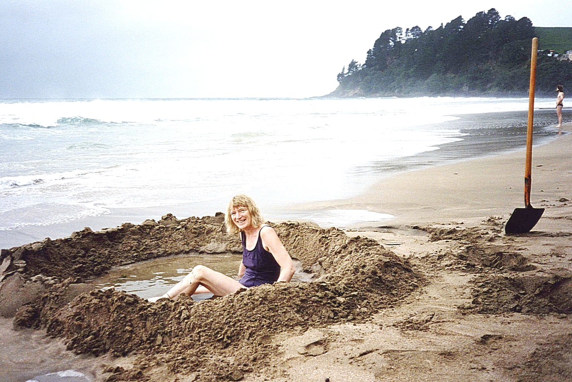 Peter added lots of useful information as we drove around. We drove past "St Helier" which looked just like Balmoral Beach in Sydney. Back at their house, we had a cool drink and then left with Peter driving in front, to put us on the right road. We now headed for the Coromandel peninsular. It was nearly midday. The morning had been warm and mostly sunny. The day continued like this – hot when the sun was out, but often cloudy. We were following the coast all the way round. It was a very scenic. We stopped for lunch beside the sea, looking across the Firth of Thames to the Coromandel Peninsula, reminding us of looking across the Dingle Peninsula in Ireland, but also looking like the west coast of Scotland. After this, the land became very flat, until we reached Thames, at the southern end of the Coromandel. The drive up the Western side was very attractive, wooded hills coming down to the beach, separated by our road. At Tapu we took a road across the middle, through more Kauri trees. The road was unsurfaced and winding and we got into the clouds. We descended on the eastern side of the peninsula and made our way to Hot Water Beach, where there was a campsite, but also there were hot springs on the beach. The location was spectacular and beautiful – a bit 'west coast of Vancouver Island'ish. After parking, we walked onto the gorgeous sandy beach and sat in one of the "holes" dug by someone else. It was a strange sensation – sitting in the dusk (it was 6.00 pm) with a new moon above, a sand "wall" around us and feeling as though we were in a warm bath, the sea just inches away, lapping at us. There was a strange camaraderie amongst the people there. We alternated our "bath" with a splash in the rough waves – an effect a bit like a sauna. We came back and showered to wash off the sand and hope to repeat the experience in the morning, as it only "works" near low tide.