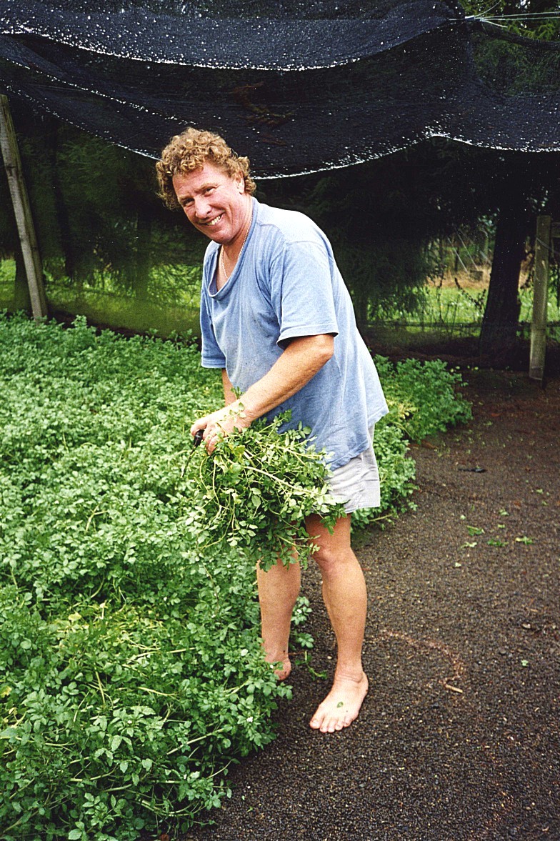 A good sleep, although it appeared to rain all night and was still raining in the morning. Jim knocked on the door, all done up in his oilskins, on his way to the shop on his bike. We went inside and chatted over tea/coffee and some time later, after a phone call to John's wife Nyree, John arrived to take us to his "hydroponic watercress beds" as promised. He had apparently stayed late at the club last night, but still seemed cheery. He is one of those people that we will cherish having met – a genuine cockney with such an infectious personality. You couldn't imagine him ever having a grudge. His wife was being ordained next week. When I asked which denomination, he said "Christian, Oh nothing awful. She sees me as her last challenge". He was dressed in a grubby, baggy T-shirt and shorts. No shoes, but no one else was wearing shoes. Jim said they told his mum it was so they could grip harder in the earthquakes! We got into the front of John's truck with him and off we went to see the watercress beds – situated on someone's farmland, where kiwi fruit and avocados were being grown. John gave us a large bunch of watercress and lots of avocados which he picked up from the ground. The trees looked rather like rhododendron bushes. The kiwis were prolific but not quite ready for harvesting. He explained to us about his watercress growing with a manner fit for any "Gardeners World". Self-taught, but very knowledgeable, with a pleasant way of imparting that knowledge.