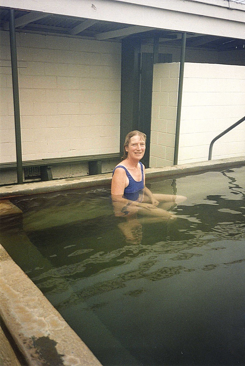 When we awoke around 7.00 am it was to a clear blue sky! There was heavy condensation on the windows which dripped down onto the bed when we wiped it off! We made our way to the "spa pool" and immersed ourselves in the steaming water. Another English lady arrived and took our photo for us.
