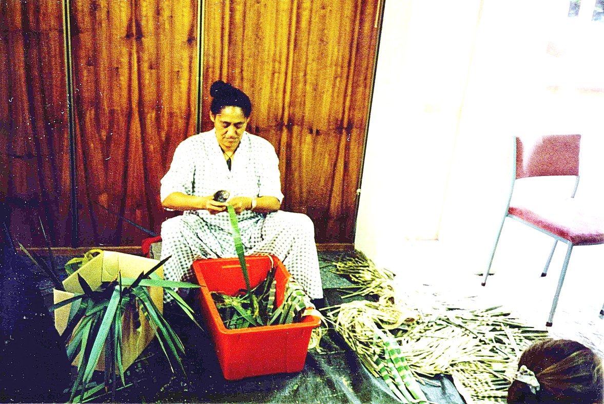 Lady making grass skirts at Maori centre at Whakarewarewa,
