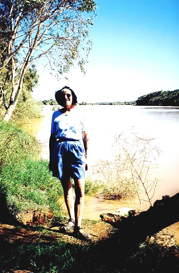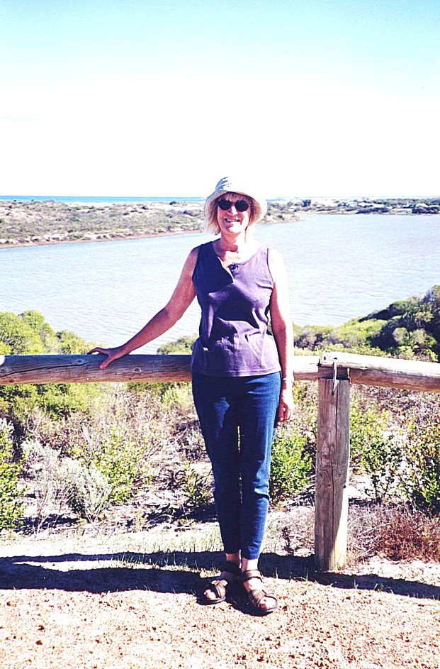 A grey morning, but we'd woken up with birdsong. The big rock behind us was just lit up by the sun, but we didn't see the sun apart from that, it was just a magical moment, which was rather like an Ayers Rock. We'd gone to bed hearing the frogs and woke up to them as well and together with the birdsong, it was very lovely and we resisted putting the radio on for a long time to listen to these sounds. When we did, we heard about Pakistan having done nuclear tests, as India had. After breakfast we returned to the Brand highway and drove back to Greenough and going up the main road, passed again the bent tree this area is famous for and a field of sheep with tiny newborn lambs. We drove down to the mouth of the Greenough River. and first walked out to the ocean. This river ended with a sandbar across like so many others. By now, it was a cold wind, but sun was warm. We moved down to the river a little and stopped there to have our coffee, and then went for a walk for a little distance along the river and then back up a bit higher, so had some nice views. The path down by the river was pretty non existent. The path at the top was a superbly made path past a group of schoolchildren who were out picking up litter [ Rosie doesn't mention it here, which is strange, as it became one of our 'popular' sayings . One of the girls found something interesting in the sand near us, and her friend said "don't tell Sir, he'll make us write about it!"].
