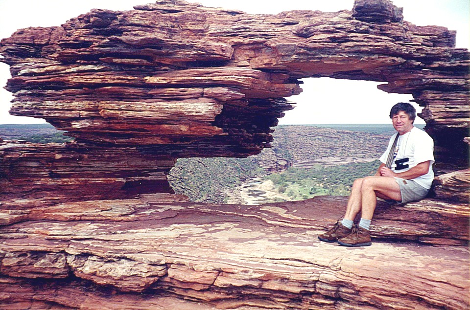 We went back to the Tourist Information to find that as far as she knew the roads were open. So we then started getting ourselves organised to leave about 10 o'clock. We stopped off at the baker's and bought some rolls and yummy cakes and went into a little supermarket and bought some milk and butter, but didn't find the bottle shop open. We then set off out of Kalbarri along the main road for about 35 km, and turned of on a track of 22 km before we took another track, stopping first at a lookout to the gorges and then continuing to Nature's Window carpark where we had our yummy cake and coffee before walking the half a kilometre to Nature's Window which is a bit of rock stuck out in a rather precarious position, viewing this very red gorge and layered sandstone. The colours just being the red of the rock and the green of the vegetation and unfortunately the grey of the sky. The sun did come out a bit, but we were absolutely plagued by millions of flies, and very off put by the lack of any directions. There was little sign saying 'Nature's Window' when you got near there, but not really in the right place and going to it was ‘at your own responsibility’, a very hairy situation I would have said.
