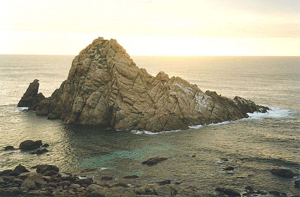 There was grass underfoot making us think of the New Forest, this being the May Day weekend, and so it all seemed very English, very lovely. When we returned we had our tea and coffee sitting outside at a picnic table and a piece of nice bun, bought yesterday. We drove down to Wonnerup Beach and had a quick look. We drove on into Busselton, a town that seemed to be growing and bustling, most like a resort that we'd seen, in fact it had a waterslide on the front and a mock lighthouse and a little play park thing for children. We walked along the beach a little bit and looked at the jetty, the longest in the southern hemisphere at two kilometres long. We bought an ice cream, we asked for a baby cone which was $1 and he gave us a normal sized one which was $2.40, rather expensive for ice creams. When I pointed out that we had asked for baby cones, he said okay then and charged us $1. We'd actually asked for maple and walnut, which he'd run out off and so we had macadamia nuts - all told we had done pretty well. We stopped a bit further along where a little river came out to the sea making a little spit on end of it. By now it was hot, and we changed into shorts, and sat on some rocks by the beach for a while. There were some wild flowers growing here, little white busy lizzie like flowers just growing out of the sand and also some scented geraniums with pink flower also just growing in the sand. We stopped for lunch in a little park area beside the sea, Adrian had a little snooze, while I went onto the beach. It was actually too hot to sit in th the sun for lunch, so we sat in the shade which was quite cool, under the trees, with our table and chairs and then we went back and had laze on the sand. Just as we were packing up to leave a couple came to chat. They were on holiday from New South Wales and we had quite long chat about motorhomes and this and that. We drove up towards Cape Naturaliste, and stopped at a viewpoint to see Castle Rock which looked quite dramatic with the light catching it with its green vegetation, but it was just a rock on the edge of the sea. We then turned off to Meelup Beach, which we stopped and looked at it, but there were about a dozen people there so we didn't stop long. We located a couple of little places where we thought we might be able to stop for tonight, but as it was only about 3.30 we decided to do a bit more of a tour of Cape Naturaliste. We continued but we couldn't see much of Eagle Bay, so we went back onto the main road and turned off to Bunker Bay. We were now in Leeuwin - Naturaliste National Park so definitely no camping here and this bay was quite pretty with sandy coloured rocks and a coarse grained beach. We just stopped there a short while and then went back onto the road towards the lighthouse. We drove next to the actual Cape Naturaliste where we had a 40 minute or so walk near the lighthouse with views of the sea in almost all directions. There was different vegetation, and a few different flowering plants here. This was a place for seeing whales and dolphins at the right time of year but we didn't see either. After this we drove to Sugarloaf Rock, on the west southern side of this peninsula.
