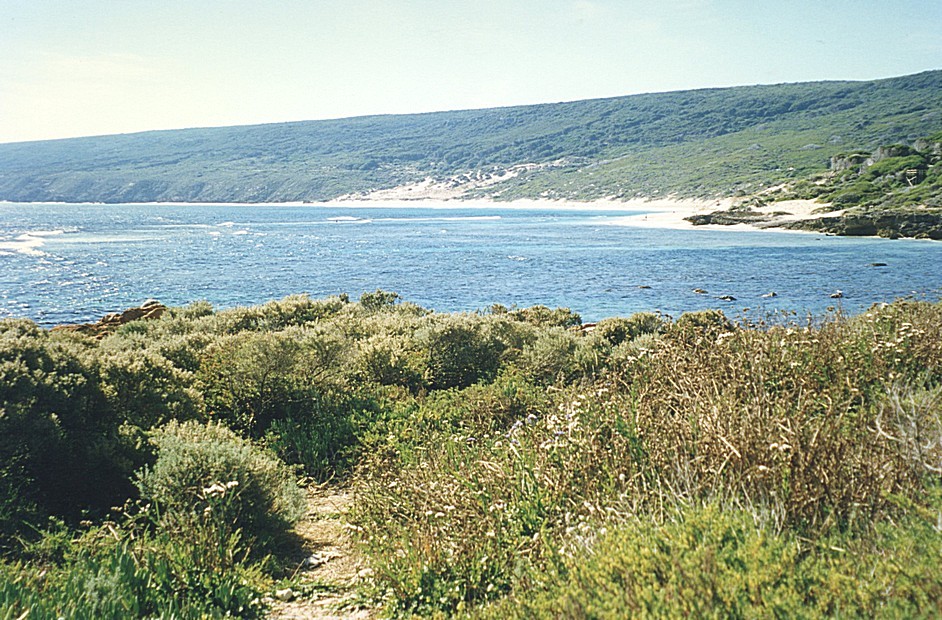 I woke to the pinking of the sky with the sun coming up, so we sat in bed with our cup of tea, watching this. The sun was behind a tree but we could see it shining down on the water. It was already hot, it hadn't been a cold night, but got hot very quickly. We had breakfast sitting on the beach on the edge of a dune with the tables and chairs and sat there chatting for a long time thinking about Andy and all the other lovely people we had known, and just enjoying this lovely atmosphere. We thought that we might stay quite a while and that we could have a swim and shower, but at that point, a family of noisy Australians arrived just in front of us. Up till then we had the beach to ourselves except for some fishermen some way, away that we couldn't really see, and so we rapidly changed our minds and decided to move on. We drove back down this peninsula to Dunsborough, and here we located the tourist information which was open despite it being Sunday, so we picked up one or two bits and pieces and bought some postcards. It was rather a flat sort of nothing township, but we'd thought we'd go on to the beach for coffee. This was only just a little further along from where we'd had lunch yesterday, with a lovely sort of green strip all along the front and no development at all. We had this bit of beach to ourselves and although there was some seaweed lying at the edge of the water it was very pleasant and warm. We had coffee and the iced bun that we'd bought the other day and looked at some of these new booklets and then the water got the better of me so I decided to go for swim. The water here was very calm being protected by Cape Naturaliste where we were last night and south of there the beaches are huge surf beaches apparently, so we decided this was the time for a swim but the water was icy cold. Adrian came in and dipped himself quickly, but we felt good afterwards. We thought we'd have a shower, so we manoeuvred ourselves to do all that in our shower cubicle and afterwards we discovered there was outside shower just along from us we could have used. We then thought we would fill the van up with water, by which time the morning had gone, it was now midday. We drove across to Yallingup, a remarkably beautiful place with white beach, green unspoilt headland right up to Sugarloaf rock, that wed been at yesterday. Deep turquoise blue sea and some contrasting red rocks, as well. We made up rolls and sat by these rocks, to enjoy our lunch - it really was beautiful and really hot.