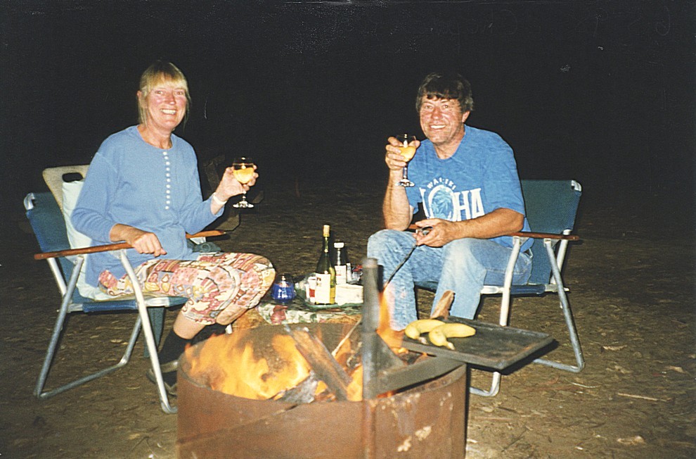 Another couple had arrived in a motorhome supposedly Australian, but his accent told me he wasn't, and he and his wife had both been born in Scotland and he then moved down to the Midlands. He had an accent which was a mixture of both and some Aussie thrown in - a very chatty person. I tried to make a damper and we cooked this in the fire and which tasted good, but so much of the outside of it was burnt there wasn't a great deal to eat. We'd also got some muffins which we toasted on the fire for lunch and they were good. The afternoon seemed to similarly go as quickly as the morning had. Adrian washed the van over making it look sparkling and clean. I wrote to Harry and Maureen and a card to Tom. The other people gave us an English newspaper, which I read and before we knew where we were, it was time start getting supper. We got the fire going well and we cooked pork steaks and baked potatoes on it and had some wine. I'd made a fruit salad and cream for afterwards.