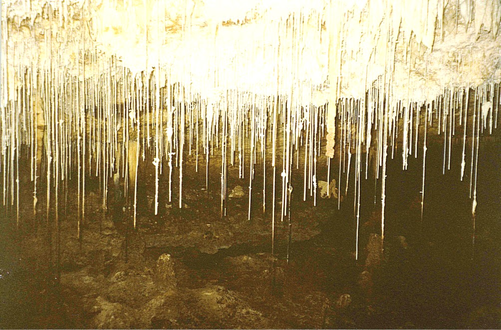 It was a very warm night, in contrast to the previous night and it rained a bit during the night. We didn't have a good sleep and got packed up and left on a damp morning at 9 o'clock. We continued on a little circle of this road southward and back towards the Bussell Highway. The dampness and greyness made us think even more of England. We very soon came out of the forested area that we were in, went into more areas of varying types of trees along this route. We backtracked a bit to the Boranup Forest Drive through another of these big forests just far enough to go to a lookout. Unfortunately, with the poor visibility there was today, we couldn't see as much as we'd like to have seen but we could see over a vast area of forest and cultivated land, and to the sea, which we could hear. A Park Ranger came and spoke to us just as we were leaving, we then set off on our way back south again. We drove down to Hamelin Bay where there was a campsite and a vast amount of parking and we briefly looked at the turquoise sea, it was grey and warm and windy. We found some public toilets were Adrian emptied the loo. We got to the Jewel Cave in time for the 10.30 tour and this was prettiest cave we had ever been in. The tour lasted an hour and we had a delightful young chap as a guide who loved caving and was pretty knowledgeable and didn't give you all the claptrap that you often get. The interesting thing in this cave was the long things called straws which we'd never seen before and also a lot of bits of stalactites and stalagmites and all sorts of formations and growing not just up and down but in all sorts of directions making it look very pretty.