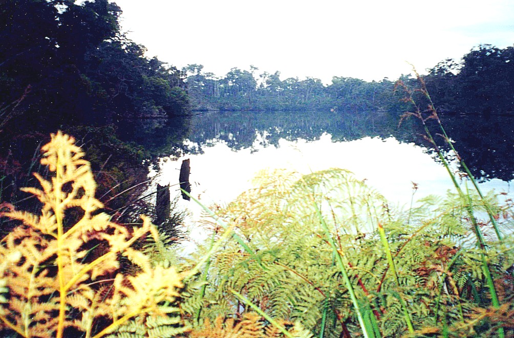 We'd heard some drops of rain in the night. We woke up late, I awoke first at 7.30 and made a cup of tea and I thought it was foggy or misty, but in fact we thought afterwards it was smoke lying in the trees which cleared after quite a while. The sun tried to come through but it was cloudy but warm. Adrian went off to get some more wood to rekindle the fire and got chatting to the other couple who were here who were travelling around with a tent. We had breakfast of bacon and egg, mushroom, fried bread all cooked on the fire and looked absolutely delicious. Unfortunately we hadn't rinsed out the frying pan, which must have had some bits of sand in, so we had a gritty taste with our meal. We had wondered whether to go for a walk, we knew there was another site some kilometres further on, but on looking at this we decided it was too far, so we just walked around this area. We found that the river was just across from where the other people had been. They had left this morning and we decided unanimously that would stay here today and for some time have a lazy day catching up and just enjoying the absolute stillness, just so still, the only sounds were birds - a kookaburra was tuning up and then off he went. We decided that we'd take the pitch that the other people had been in - the river meanders right around us, but it was too late last night for us to realise this. We moved the van across to the other side, their fire was still smoking a bit and Adrian busied himself happily collecting wood. I got down to the river and thought this was the time for a swim, so stripped off and had a cold, but enjoyable swim. We thought we would just enjoy this day being here in the forest and the morning was soon gone.