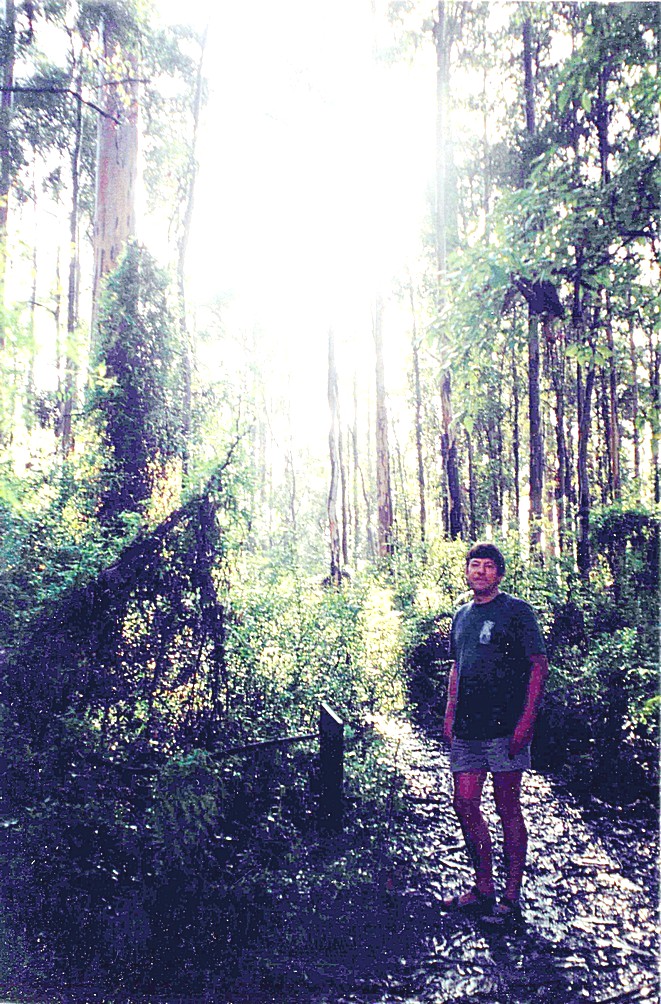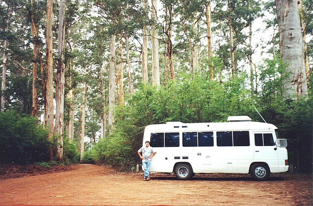 Maidenhair ferns were growing everywhere, obviously just sprouted after the rains and we stopped and looked at a Karri tree that you could walk through. While we were looking at this tree a big branch fell off a tree nearby, we didn't see it, just heard crashing down. We drove on into Pemberton trying to find out about a steam train journey. We tried to locate the tourist information but first found the forest information. We then found ourselves at the railway station and found that a train was running tomorrow. We went to tourist information as well and we had lunch sitting outside there, where I came over feeling not very good. We hung around in Pemberton and managed to do the washing in a laundrette there, so that was good. We sent some post off, one to Douglas for his birthday and one or two cards. By now it was quite late in the afternoon, and we drove out south and we went down a track to the Cascades and we had a little walk around and saw some more little waterfalls there amongst the tall trees. We turned off to the drive which was in the Warren National Park and it was called Heartbreak Trail and halfway round the trail changed his name from Heartbreak Trail to Maiden Bush trail.