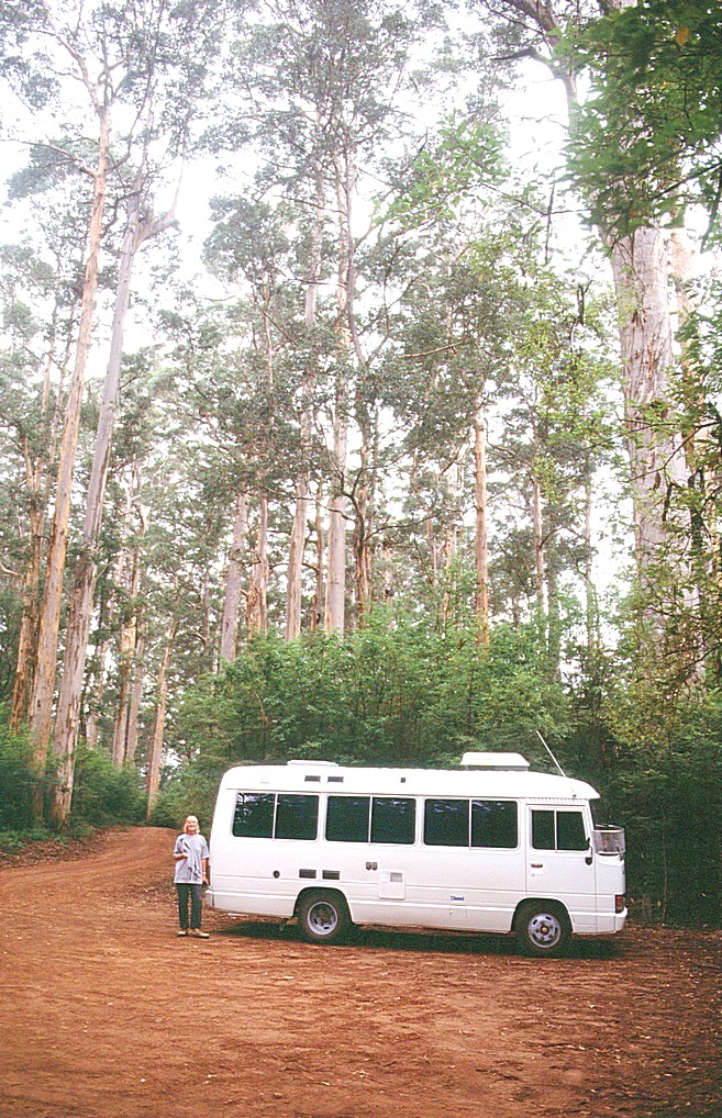 We headed towards Pemberton and found that the Stewart Road had been made up, it wasn't marked as such on the map, and that made the going very quick and easy. We stopped for an early cup of coffee on the road some miles before Pemberton. We went on a little drive through the Beedelup National Park, there were huge trees again and we stopped to walk to the Beedelup Falls where there was a circular walk via a swing bridge one way and one tree bridge the other way.