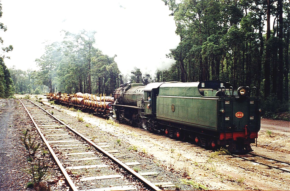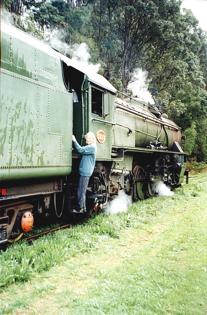 We drove back to the station and had an early cup of coffee and waited for the train. While we were doing so the sky blackened and it rained torrentially. The steam train left supposedly at 10.30, but it was rather late in leaving and it wasn't much fun sitting around in the rain waiting for things to happen. The chap who seemed to be the owner of the train came and told us what was happening and then we all got on to it and off we went with the chap driving his engine with one other person on the footplate. We quite soon stopped at a house and picked up a little boy of five or six presumably his son and those were all who were running the train. It was meant to be a round journey of two and three quarters hours, but we actually didn't get back until getting on for two, so that was three and a half hours. We didn't go a great distance, but it did get up quite a good speed and it was through pretty country mostly wooded, but fields as well. Adrian loved it because it was full of events. We stopped at one point on the way and everyone got off the train and they did one or two things to it. I don't know what and then we all piled back on (no guard to check us) and went to the Diamond Timber Mill and luckily there were loos here because there were none on the train, no provision for food or drink either. Luckily I had thought there might not be anything so had taken some lunch which we ate on the way back and we were very glad to have. At the Diamond Mill we all hung around while they picked up some trucks with huge tree logs on.