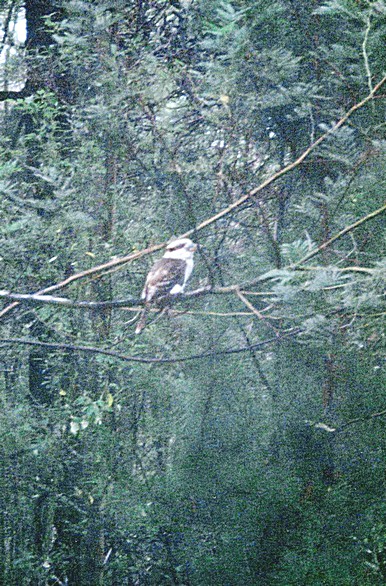 Luckily the weather was sunny most of the time, it did rain a bit while we were at Diamond Mill, but mostly fine and sunny. On the journey back we went up a hill which the train was having great difficulty with getting up as the wheels were slipping and so it was a real bit of - I think I can, I think I can, I know I can, I know I can, I told you so, I told you so. When we got back, the engine driver (the owner) came back and apologised, he said it was gum on the rails. It was two o'clock by the time we got back to the coaster. We set off now for Big Brook Arboretum, going on the Rainbow Trail which evidently was an old logging track. First of all we came to the Big Brook dam which was very picturesque with the sun shining on the dam and it shone for the rest of the afternoon. We drove around to the arboretum where there was a camping site and it came over a bit black but I had at that point that decided to go for a walk, but it was a bit of a trail, so off I went on this trail running for a lot of the way in case Adrian wondered what happened to me. He in his turn was sitting watching a kookaburra, which I photographed on my return.