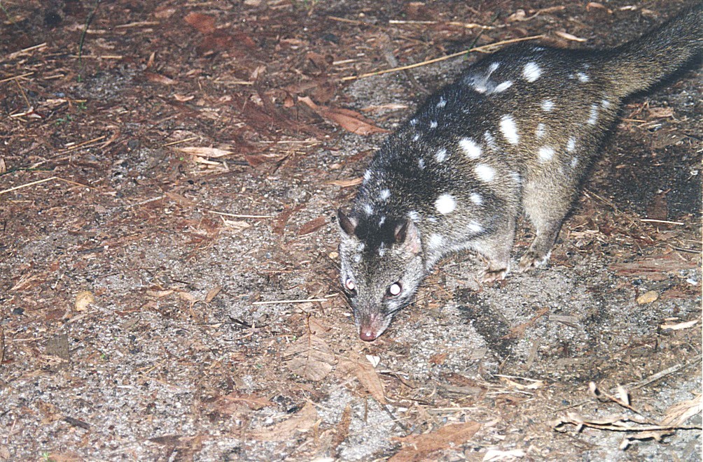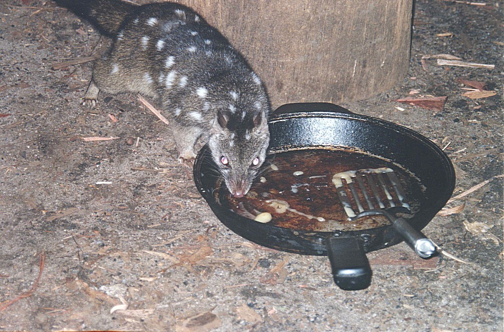 We came back past the campsite and walked up the other side by which time it was getting towards dusk and time for Adrian to get the fire going and for me to prepare food and we then spent an evening outside. The sun had gone early, so although it was still a blue sky, it got chilly early and it was a very, very cold evening. The full moon came up later on but took a long time to rise above the trees. Our meal was very much interrupted. We'd found the baked potatoes weren't cooked and put them back in, so we had the steak and other vegetables, but as we started to eat we had one bit of wildlife after another and there were two significant animals. One was a little Quenda, which was a type of bandicoot and he came quite briefly, but prior to that and then again for the rest of the evening were these little animals called a Chuditch or Western Quoll. We looked on the notice board to find out about them, and they are a marsupials, rather pretty with white spots on a brownish back and a dark brown tail. They had a pretty little face and you might think it was a cat coming or rather squirrel like.
