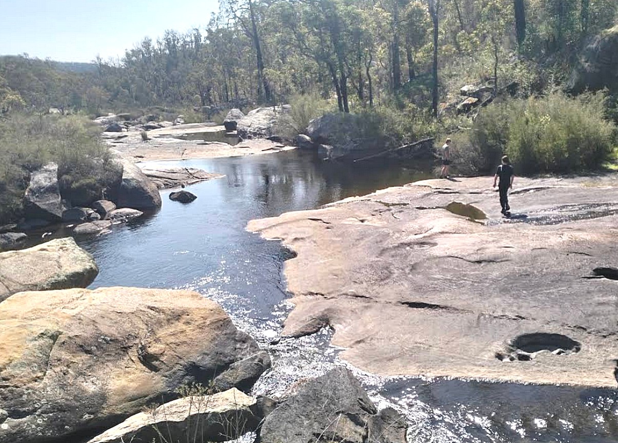 It was a very deep sided and deeply wooded area and we followed along the Collie River until we came to the place where we were going to stay called Honeymoon Pool, a wonderful name and obviously a popular camping site in the summer. There was no one else there when we arrived but there were a lot of camping pitches along beside this river. Having located the spot we were going to stay at, Adrian collected some wood. There were several walking tracks out from here but all too long for us at this stage of the day, so we set off on a walk beside the river, which was very pleasant, the river was flowing and very pretty. As we set off on the walk we saw a Kookaburra, right there in the tree in front of us and I managed to take a picture of him, and a black cockatoo. We'd hoped that we could cross the river and come back on the other side and we did actually manage this. Adrian was quite impressed by the antics we did to get across, there were large rocks in the river, and with a bit of moving them in the middle, we made it to the other side. It was quite a walk in the end, well over an hour.