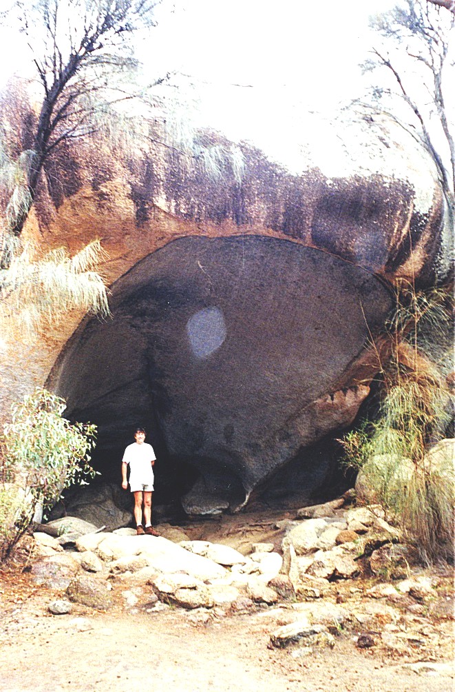 We then set off north for two more excitements. These were the Humps and a round dam which had been constructed next to them. The Humps were another circular outcrop of granite and in these was Mulka's Cave which was just a large hollow. You had to duck to get into it, the entrance wasn't very big and then was just like a circular bit with Aboriginal handprints on the ceiling.