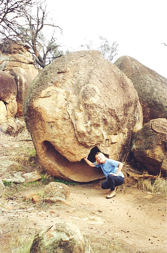 There was no really explicit map of the area, which was very much lacking, to know what we should be looking at. We walked back to the van to have lunch, we were going to sit at a picnic table and we moved the van down to it and found the logs to sit on didn't reach the table. Adrian decided this, together with the flies which attack your face very nastily, weren't worth the effort of staying outside for. Then we had a drop or two of rain, so we had lunch sitting inside. Afterwards we went off to take a slide of the view of Wave Rock, but there were some rocks nearby, as we walked past, which looked like heads and faces, rather like the the Dundas Rocks. We thought these were just as interesting as Wave Rock which was just a load of hype.