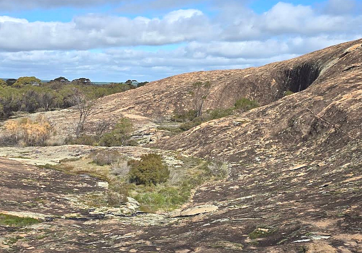 Monday 18th May 227 km I hadn't slept well and woke early. Adrian got a cup of tea before seven and it was misty. We looked out on what looked like an African landscape and lay in bed with our cup of tea watching a group of yellow throated minor birds on the tree outside and also some Port Lincoln ring-necked parrots. It had been a warm night despite the supposedly clear sky because we could see the moon, but we watched the mist roll in during the morning. We left at 8.30 and hoped we were going the right way. We had got it right and after half an hour we came to a crossroads and we were 7 km from Corrigin, so we turned in that direction. We soon came to a little dog cemetery, which we got out and had a fleeting look at and just as we got back to the van, it suddenly rained heavily . We diverted to a lookout on a short unsurfaced road called the ‘wildflower trail’, it was the wrong time of year for flowers of course, and it wasn't very pleasant in the heavy drizzle. There wasn’t much to see in Corrigin, I posted the letters and we found a Foodland, but there didn't seem to be a a baker's anywhere, so we bought three rolls and a bun, some Vaseline and some butter and the lady said how nice that it was raining and we said no it's not. She said it would be colder out at Wave Rock - thanks. Adrian went to the hardware store and there was a sign in the window saying 'closed today, okay'. We saw a sign to Gorge Rock which I'd seen on the map and knew no more about it than that and we followed a long sandy track to what would have been a nice overnight stop and it had now stopped raining and was pleasantly warm. We then had a walk out onto this vast area of granite rock. In between two large portions of the rock a little dam had been made and some water was being collected.