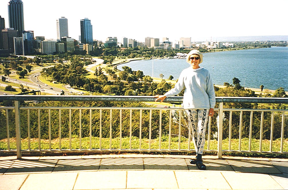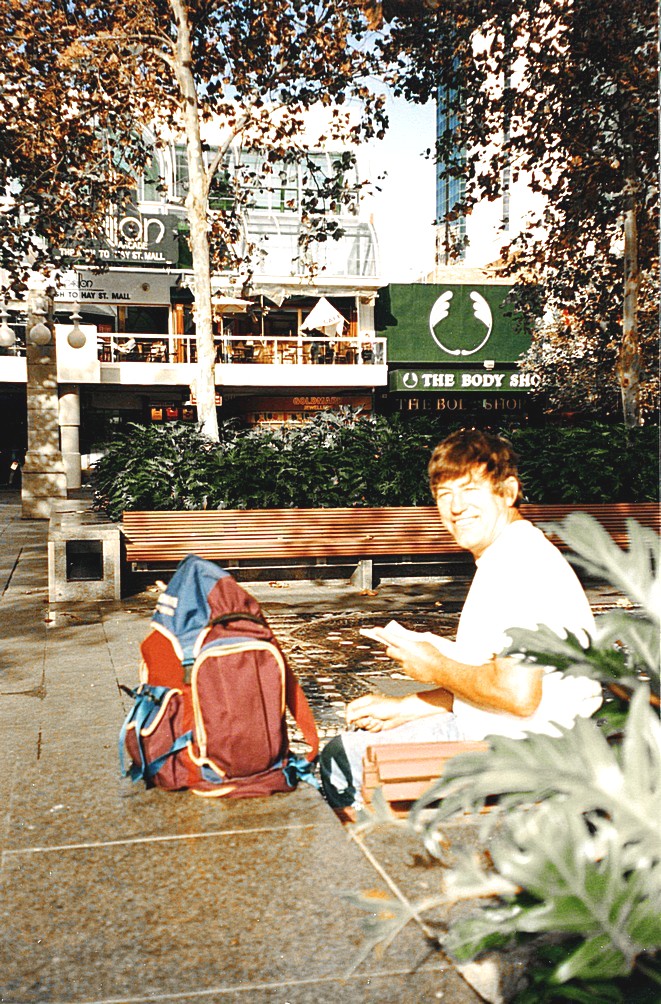 Thursday 21st May. 12 km We awoke early to nothing much of a morning, which supposedly was not going to be a brilliant day from the forecast but we'd planned to go into Perth and we're ready to leave at 8.10. We drove down to Guilford Station and caught the train in to Perth, quite trouble free but rather like travelling into London or Melbourne or anywhere else. We looked around Perth which had a large area of shopping malls with duplicate shops, so we got absolutely confused about where we were, there seemed to be two of everything. There were lots and lots of shops, both of the cheapo kind and rather select shops with dainty clothes etc. The first thing we did was to go to the post office and collect our post, it was very quick and easy to do that and it was all family letters - a postcard from the New Forest, one from the Cape get together for Val's birthday and one from Simon, from which we learnt that he was going to be working in Holland for a year. We also went to Cathay Pacific and that saga goes, they don't act now as agents, we had to ring on their phone and have a 20 minute or so wait to get answered. We finally changed our homeward tickets to December, but weren't able to book seats on it. The weather was very variable, sometimes sunny, sometimes heavy showers. We had coffee and shared a piece of carrot cake in one of the numerous coffee places that there were, there seemed to be lots and lots of eating places, and for lunch, we bought a baguette, cake and drink and sat outside the post office.