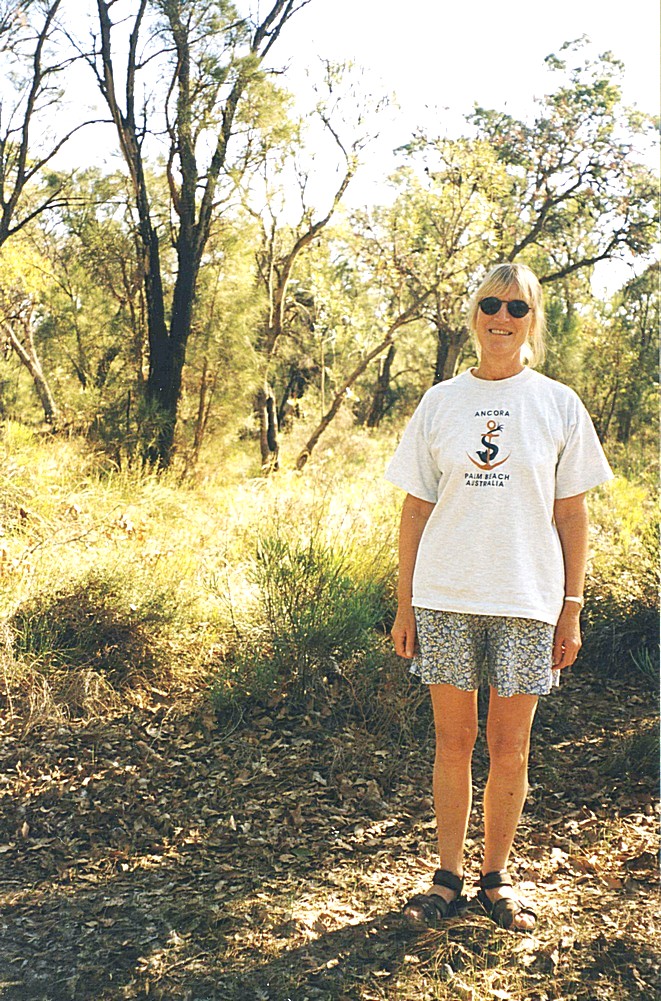 We stopped there beside the Leschenault inlet looking across to the Leschenault peninsula, which was a conservation area and now has no roads on it for access by vehicles. There was an absolutely clear blue sky and the water reflected blue and for the first time for a while we felt really hot, and we realised that this is what we'd been missing. So we had a coffee stop there and looked at maps and located ourselves for our next bit of expedition, which is travelling north. We turned off just after a place called Binningup, or a road to it, onto another road, which supposedly went down to the coast but it was a very bad road. We stopped at what could possibly be called a camping place, it said it was 300 metres to a lovely golden sandy beach. We had different opinions of which way to go, Adrian was right, so we ended up doing the long trail up and over dunes to no avail. When we went on the correct route, we found a fisherman with his van on this long, truly golden beach [probably Myalup beach], so we didn't stop and returned to the van. We had seen some pretty blue flowers growing on a prickly bush, and we'd also seen a trail of furry caterpillars end to end like we'd seen in the Flinders. I was in vest and shorts for the first time for quite a long time, it was really hot. We pulled off for lunch at Old Whitaker's Mill picnic site, but we couldn't find any sign of Old Whitaker's [Timber] Mill. It was semi shady under a lot of pine trees and there was a whole flock of ring-necked parrots here. We drove off the road down to Preston Beach, a long sandy beach again and it was pretty cold, when I dipped my feet in and Adrian emptied the loo here. We returned to the main road stopping briefly at Lake Hayward which was rather low on water, but nice to be out in the sun. We were now looking for somewhere to stay although it was still quite early, and there was a lovely lot of water around here, the Harvey Estuary and the Peel Inlet, almost totally enclosed by land with Mandurah at the north. We drove down to Avalon and along to Falcon. At Avalon, there was a place we could have stayed, but we weren't that impressed although we had a walk on the beach. We tried one or two other places, but got nowhere, so we ended up in Mandurah in the tourist information and found a leaflet on the Peninsular Caravan Park [now a posh development, there was no Rosie picture of the campsite and now it has gone!] just around the corner which we made for. This site wasn't especially exciting but it cost $13 and that was with electricity. We sat outside in the warm sunshine, had a cup of tea and then went out for a walk around this little bit, which was called the peninsula. We could walk around the waterfront right into Mandurah itself which we did and found a pedestrian street [It is now a very posh area being so close to Perth]. Adrian bought a phone card and as we went to walk back the sun had just gone down, but the sky was a beautiful glowing orangey colour. I then prepared veal steak and vegetables, which I did in the microwave, something I'd not done before at all since we'd been away because we'd only had had electricity a couple of times. I then made a fresh fruit salad for afterwards with some cream, which cost 99 cents about a week ago for a great big pot. We looked at all the leaflets for the ongoing Perth-Fremantle area.