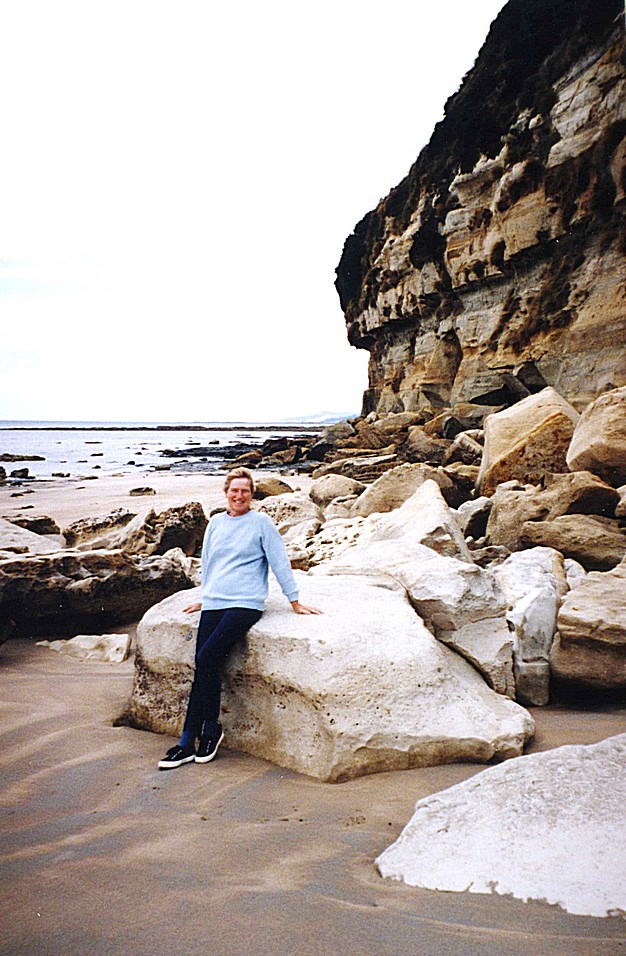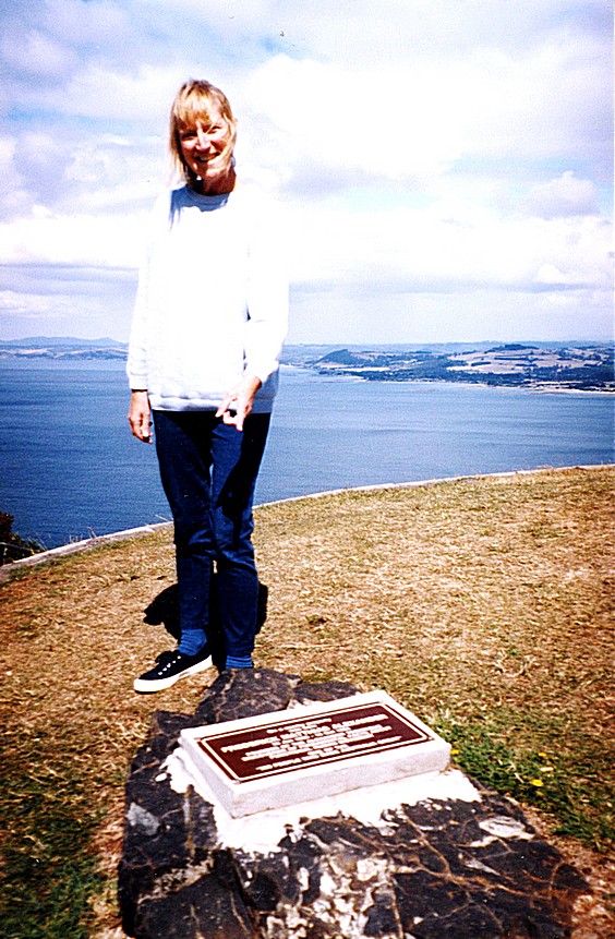 Thursday 5th March 163 km in hire car A rather disturbed night followed, as I didn't like the idea of being shut into this large shed, and despite Adrian's efforts getting up twice, to try and stop door rattling every now and again. It's a huge rattle like someone trying to get in and various other noises during the night. At 7.00 in the morning, we were woken, I'd just got up and found my watch had stopped and wondered why it was light and someone was rattling the door to get in. We then had another tumultuous time as we still didn't know what was happening about the engine. We'd heard it was up north somewhere and needed to be transported down, which would take time and John hadn't got the money and all sorts of problems. John then arrived and lots of conversations ensued and things changing by the minute and we had moments of great depression, thinking it will be weeks before we'd be on the road. We seemed to end up with the idea that John was going to get a new engine, all new parts, and Russell is going to fit them and with luck, it should be ready for our return from Tasmania. We got ourselves all organised and John in fact gave us a lift down to the station. We got the train in to Melbourne, got off at Spencer Street, and went across to the coach station and we got the to the coach to the airport, it was just gone 10 o'clock. It took us an hour to get to Melbourne airport from there. The next place that the driver stopped, I had time to nip to the loo and to get back, for which I was grateful. We arrived at the airport and after checking in - no problems at all, we then went in search of Cathay Pacific who had moved their offices to the airport from Melbourne centre, where we had been the past couple of days. They had just moved there and there was a bit of confusion but we eventually found the office in an upstairs corridor and we couldn't just straightforwardly change our tickets for going home, the lady needed to send off and find the price and all sorts, so we had at least set that in motion. We then came back, I had a cup of coffee from McDonald's, would you believe, but it only cost $1, so a cheap cup of coffee. I sat with that and some sandwiches which I'd made up this morning with some nice bread we'd bought last night on the way home from Melbourne and the last of the silverside beef that we had. It was like a late elevenses, early lunch. We then went through to catch our plane, there were only nine people on this small aeroplane - 9 passengers, and one Steward, a nice chap looking after us. We had a very pleasant flight across to Tasmania, cloudy part of the while. The morning had in fact been cool and we had a shower of rain before we'd left Melbourne, but quite bright and quite variable. We arrived in Tasmania and it certainly was cooler, it felt like an out of season holiday in England. At the airport we went straight through to collect our car, a young girl called Belinda I believe, only second time she'd done this she'd said filling in the form, and we had a nice chat with her. This all went without a hitch, we collected our car and bags and off we set wondering where on earth we were. We'd come into Burnie Airport but we weren't in Burnie at all, we were in Wynyard. We quickly found the information office and were immediately accosted by the chap in there trying to be helpful. He was ex- Englishman from Shropshire and gave us lots of leaflets. We were quite befuddled by it all having suddenly come on this trip to Tasmania and knowing nothing about Tasmania at all, we had planned this for the end of our trip, We set off westwards along the north coast stopping first at Fossil Bluff, a cliff with some fossils and lots of shells.