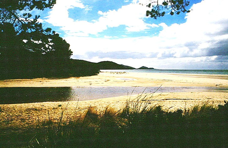 Monday 9th March 241 km in hire car We awoke to a clear sunny morning after a good nights sleep, Adrian tried to change our hotels so we could have another night here to discover a bit more of this southern part of Tasmania, but we weren't able to do that. We turned on television on to Discovery Channel and found a programme about the platypus which was very interesting to watch as we got back from breakfast and got ready to leave. By 9.30 we were crossing the superb Tasman Bridge towards Sorell and the water looked very calm and reflecting in the early morning sun. We crossed the two causeways to Sorell, it looked very beautiful and peaceful and we watched fish jumping. We stopped at Buckland at a dear little church and looked around the churchyard, very historic, very old for Australia. It had stained glass windows in the church. We discovered that the coffee which I had foolishly thought might have stayed in the polystyrene mugs had leaked out into the bag and over the food. At Orford, we went for a walk along beside the river. It was a track built by convicts in the past and we walked for almost an hour -very peaceful. It was warm and sunny. We saw several butterflies but the most notable thing about the walk were hundreds and hundreds of little lizards that kept crossing our path, some of them were tailless lizards. We returned to the car, it was gone 12 o'clock and we drove a short distance and stopped by a beach [Triabunna]. There was the most exquisite view of white beach, a long sandspit coming up in front, and land almost enclosing from both directions. Then there was a very high island just out to sea and more of the coast up towards the north. It was turquoise sea, absolute clear blue sky, white white sand, warm and sunny with a slight cool breeze. We had our lunch there and we saw seagulls again with the dominant one making a right row, also herons and oystercatchers. We stopped a bit further on at a sign which said Hermitage Rd and took a photograph.