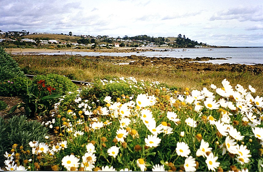 Friday 6th March. 282 km in hire car We got up to a fine morning, pleasantly warm. Adrian had been out last night and purchased some food so we were able to have breakfast in our room. I wrote one or two postcards and we got ourselves organised. We had managed to change our hotels and get a night in Hobart and we left just before 10 o'clock. We stopped in Ulverstone and went in the bottle shop and got some wine, beer and soft drink and found a little newsagents where we got a decent map of Tasmania, some chewing gum, soft mints and I got an italic pen. We left there at 10.30. We then headed for Penguin on the scenic route which was along beside the sea, as a new road had been built which we'd come along yesterday and then there's us, the railway line and then the pretty coastline. We enjoyed again these glorious trees with red flowers which we'd seen in Tasmania but nowhere else. Penguin was a really pretty place with some very lovely gardens. It had the most delightful embankment to the railway, which was just like a herbaceous border of flowers different daisies, gazanias, cannas, hebes and then the railway line and then the beach.